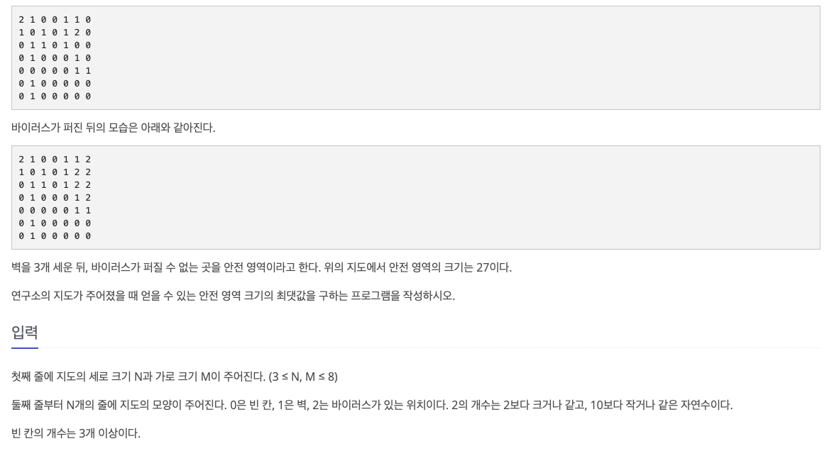 이 문제의 경우는 경우의 수가 얼마 존재하지 않기 때문에 3개의 벽을 선택하고 각각의 경우에서 바이러스가 전파하고 남은 영역이 몇개 존재하는지를 체크해주면 된다.