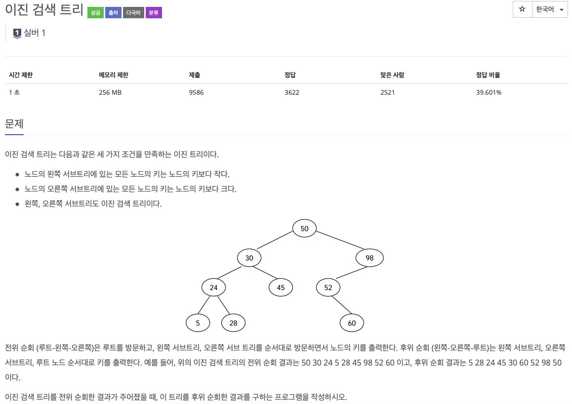 즉, 전위 순회를 한 데이터를 기준으로 자신보다 큰 숫자가 나올 때 그것이 오른쪽 노드의 시작을 의미함을 이해할 수 있다.
