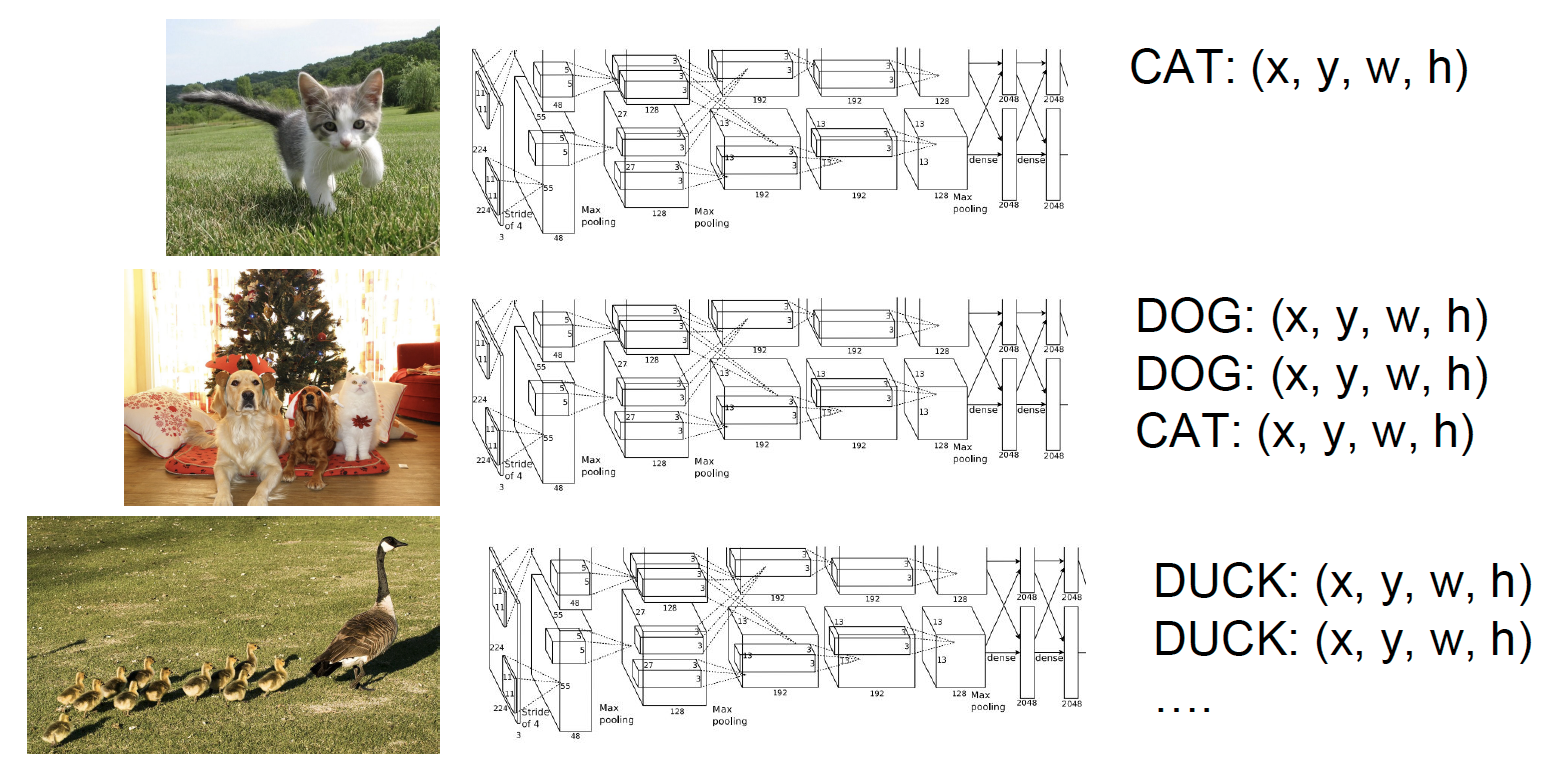 정의만보면 Classification + Localization이 하는 일과 유사하게 느껴질 수 있으나, 위 작업은 output값이 이미지에 따라서 달라질 수 있고 classification + localization의 경우는 output값은 고정되어있다는 점에서 차이를 가진다.