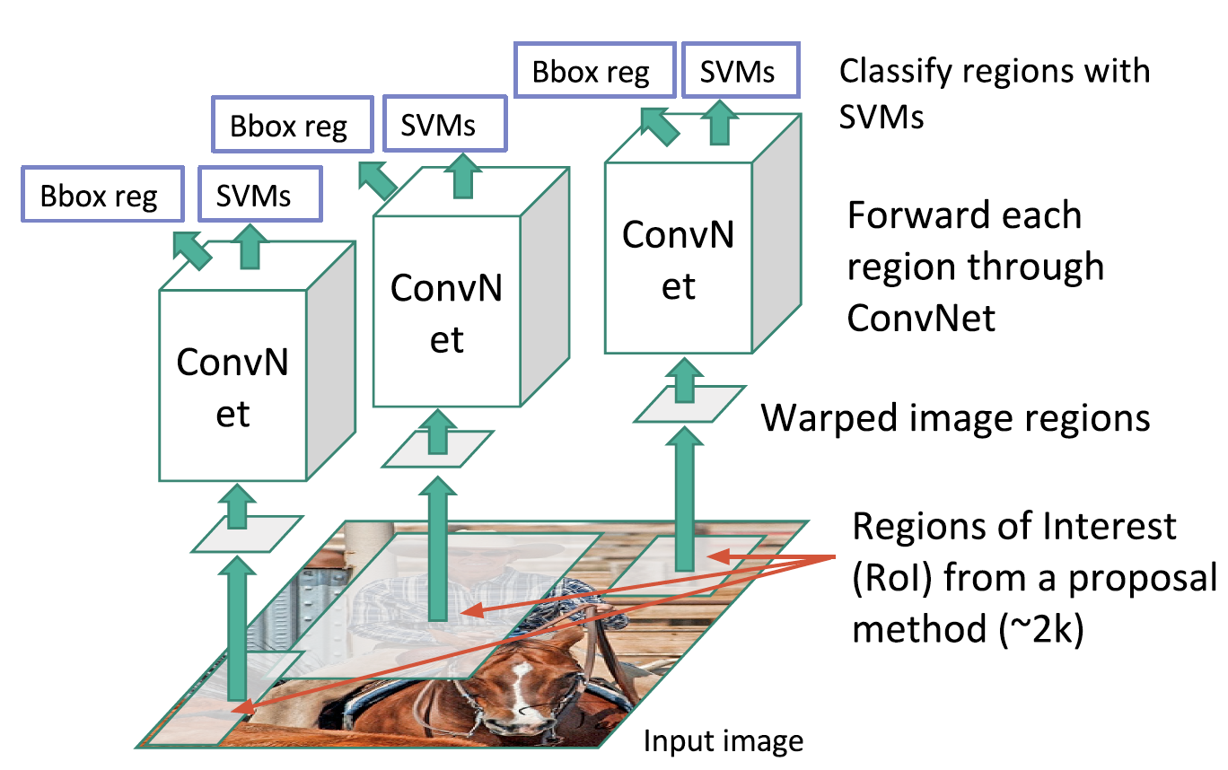 Input image를 대상으로 region proposal을 수행한다. 해당 영역을 각각 CNN을 통과시키고 classification을 수행하고 실제값과 비교해서 loss를 계산해주면 된다. 다만, CNN의 경우 input image의 size가 고정되어있으므로 Warped image regions에서 이를 일괄적으로 조정한다. Bounding box의 위치는 Regression을 통해 학습함으로써 조정한다.