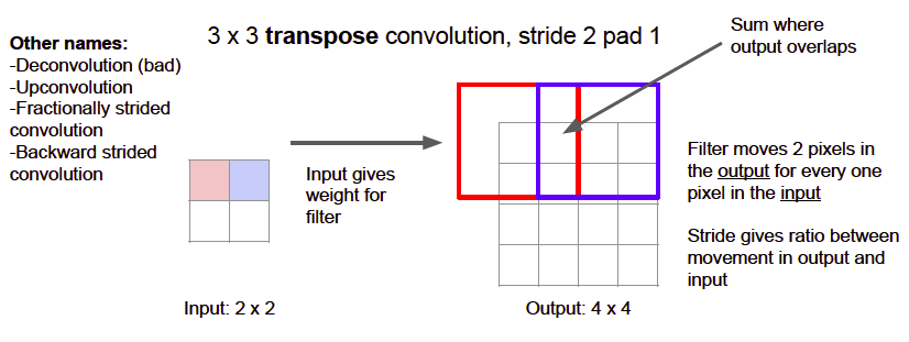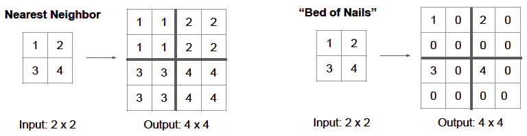 위 사진처럼 단순히 current value에 해당하는 pixel를 넓히는 "Nearest Neighbor" 방법도 있고, 좌상단에 current value에 해당하는 value를 넣고 나머지는 0으로 initialize하는 "Bed of Nails"방법도 있다.