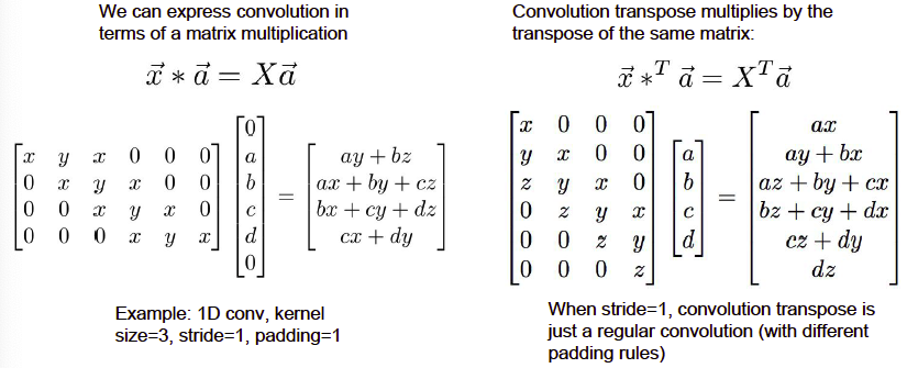 위 사진에서 볼 수 있는 것처럼 기존의 convolution 연산도 matrix multiplication으로 표현할 수 있고, transpose convolution 또한 matrix를 transpose한 것의 multiplication으로 이해할 수 있다.