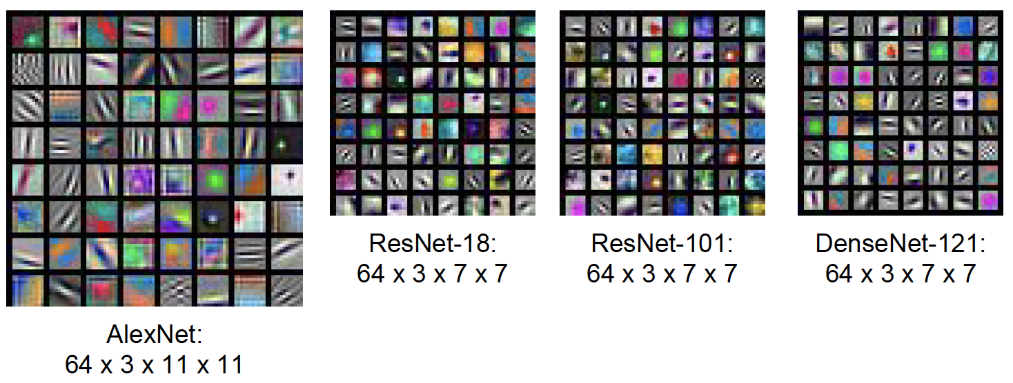 그림에서 볼 수 있는 것처럼 architecture의 종류와 data의 종류와 무관하게 first layer는 선분이나 다양한 색깔을 포함하고 있는 양상을 띄고 있다. 그러나 First layer의 경우 input값이 original image이므로 이러한 분석을 쉽게 할 수 있지만, 이후의 layer의 경우에는 이러한 분석을 취하는 것이 어려워진다는 문제점을 가지고 있다.