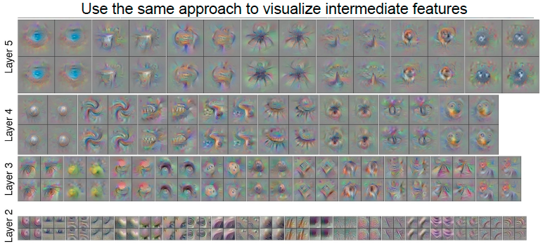 물론 중간 layer에 대해서도 동밀한 작업이 가능하다. 속한 label이 나올 score를 maximize하는 방향이 아니라, 중간 layer에 있는 neuron이 최대가 되게끔하는 image를 추정하게 된다.