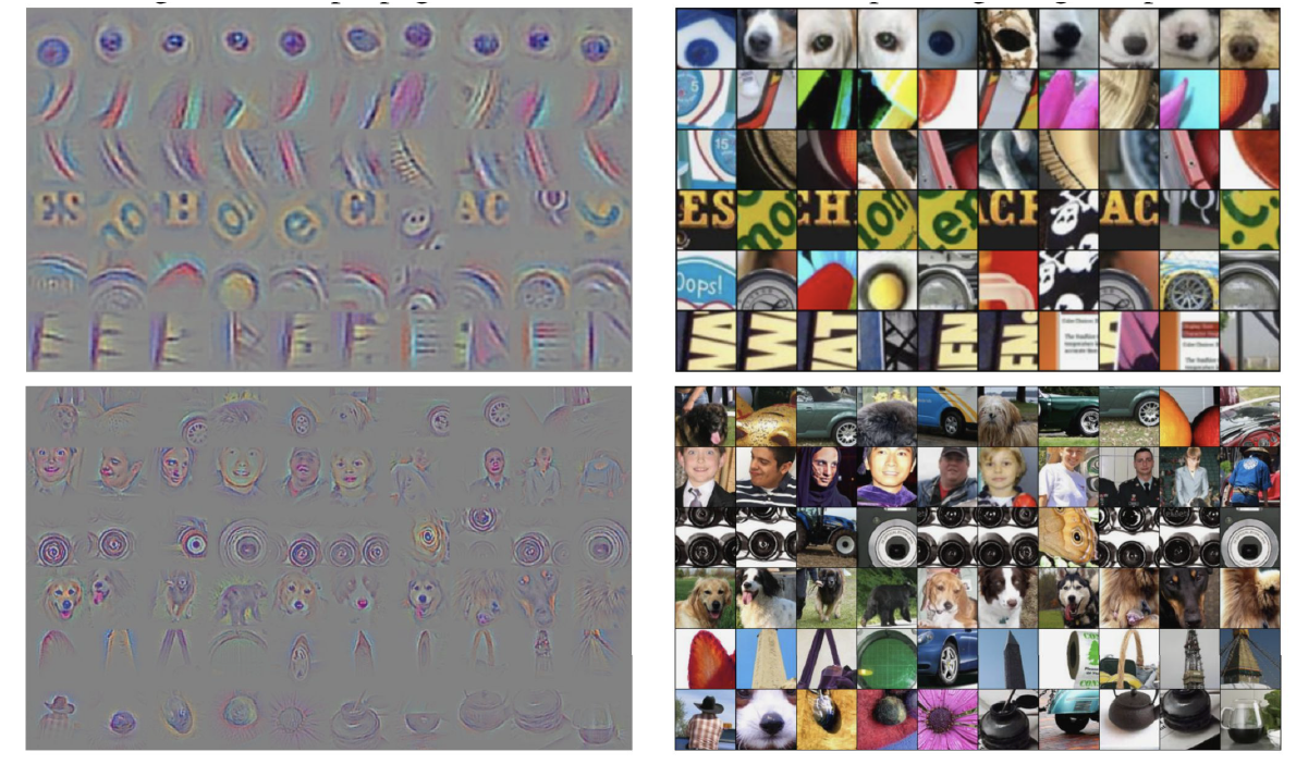 왼쪽은 위의 방법을 활용해서 얻은 결과이고, 오른쪽은 앞서 살펴보았던 Maximally activated patches를 활용한 결과이다.