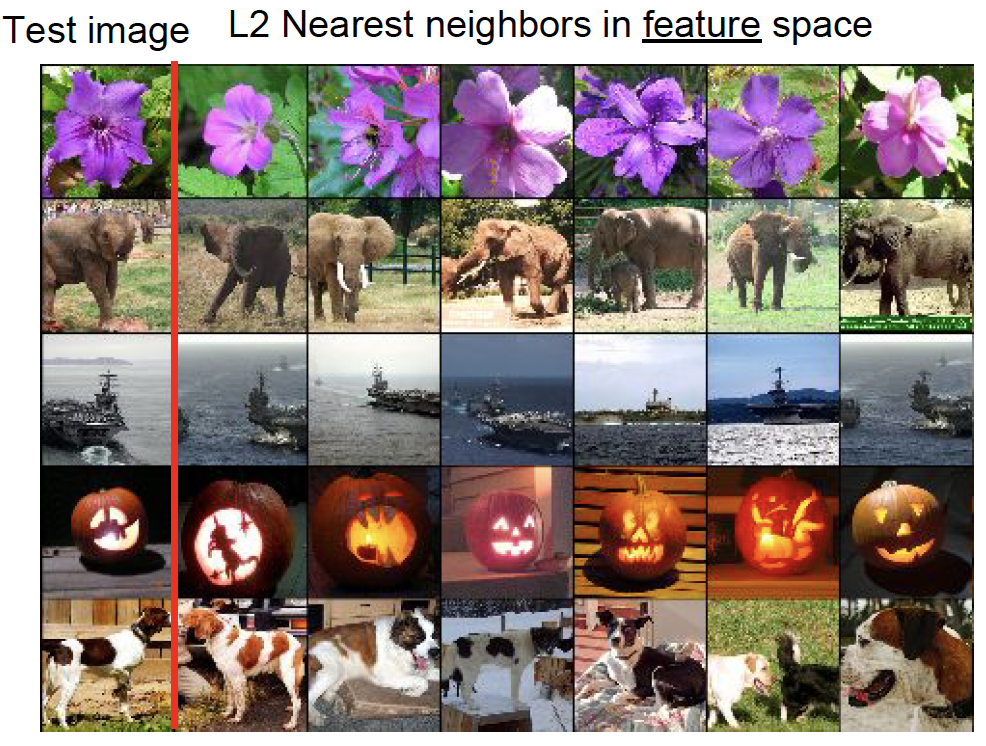 앞에서 기록한 4096 dimensional vector 사이의 유사성을 기반으로 묶는다. 이전에 학습했던 Nearest neighbor의 경우는 pixel 사이의 유사성을 기반으로 판단했다면, 위 경우에는 CNN을 거쳐 나온 마지막 결과를 기준으로 분류하고 있으므로 feature 단위의 유사성을 판단하게 된다.