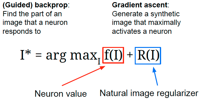Gradient Ascent와 비슷해보이지만, scoresk 중간 layer의 neruon이 최대로 출력되게끔하는 image를 찾는 것이 아니다.