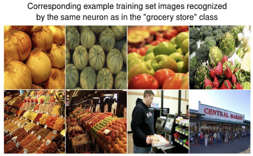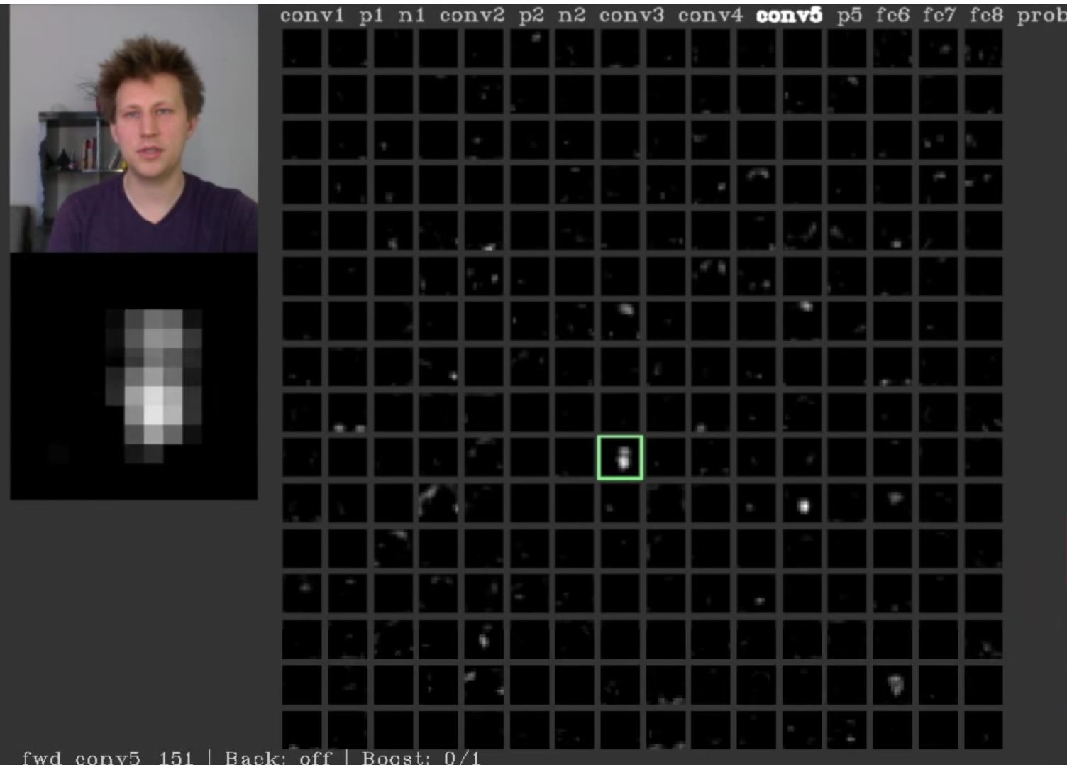 일단 128개의 Activation map 중 1개를 선택한다. 그리고 많은 이미지를 CNN에 통과시키고 해당 feature map에서 maximally activateed되는 곳을 관찰한다. 이를 바탕으로 해당 영역에서 처리하고 있는 feature를 추정할 수 있다.