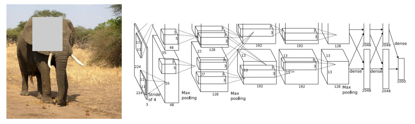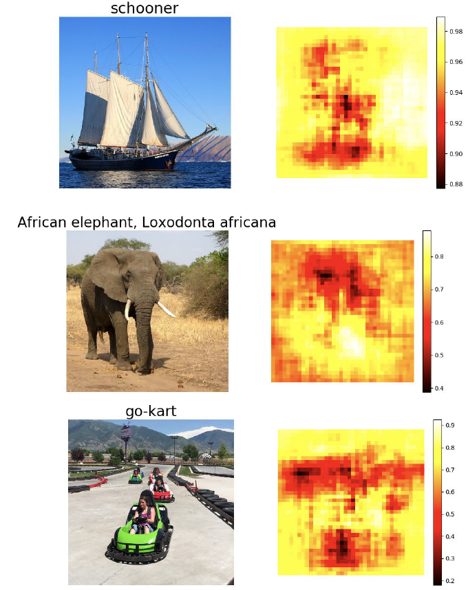 위 방법은 상당히 독특한데, input image의 일부를 가리고 이를 CNN에 주입힌다. 이를 바탕으로 어느 영역을 occlusion처리 했을 때 label을 잘 예측하지 못하게 되는지를 추정하게 된다. 즉, 해당 영역을 지웠을 때의 예측 확률이 가장 크게 떨어졌다면 해당 영역이 중요하다는 의미로 이해할 수 있다.