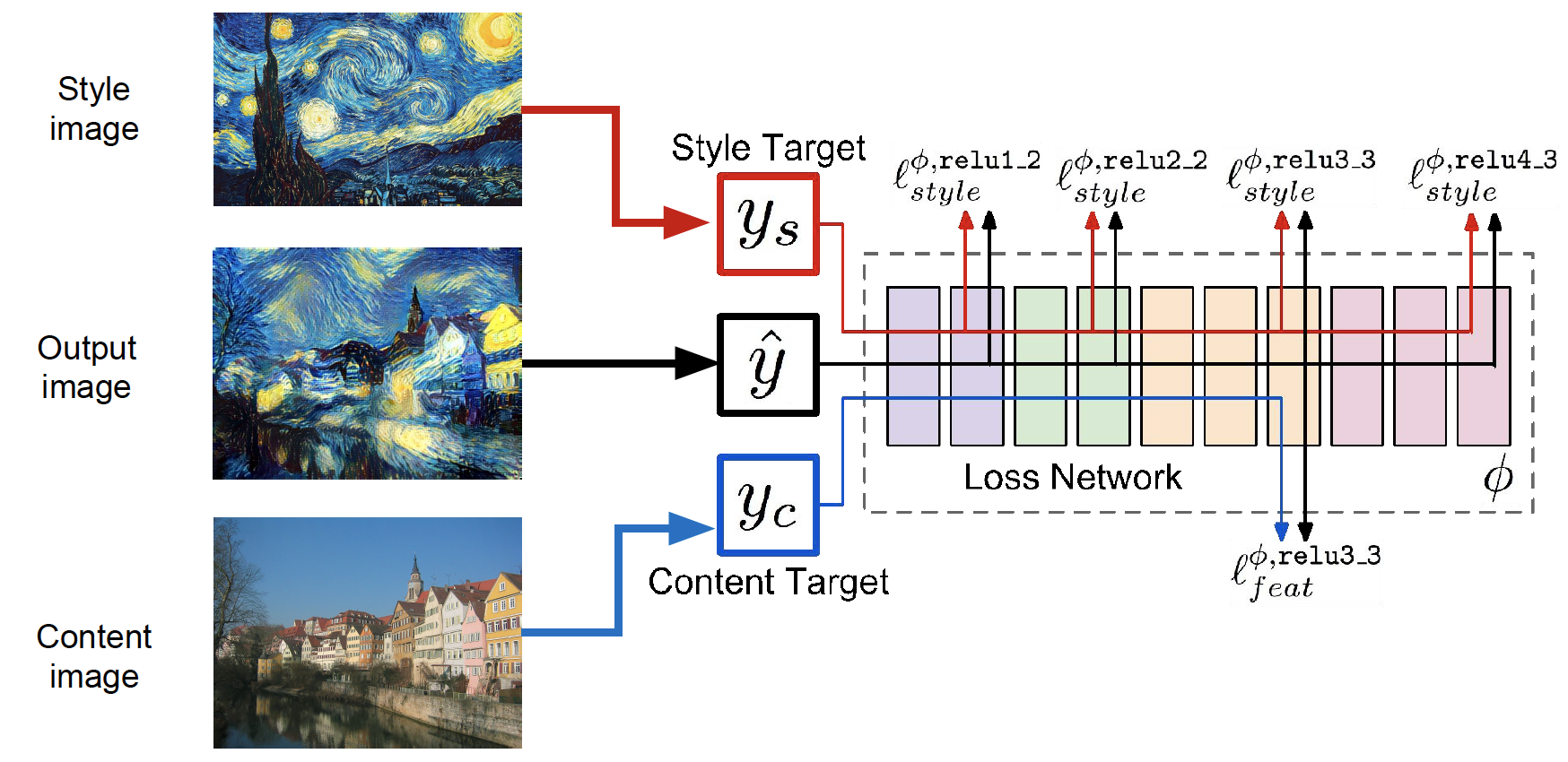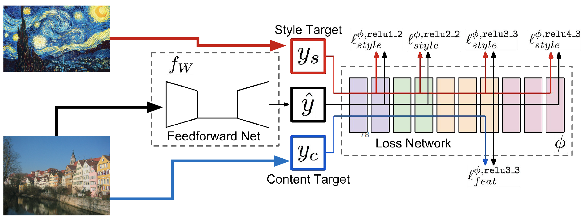 최종 이미지는 content imaged의 feature reconstruction loss가 작고, style image의 gram matrix loss가 작아지는 방향으로 그려지게 된다. 이 방법의 문제는 backprop / forward 작업을 많이 해야한다는 점인데 style transfer를 위한 네트워크를 따로 학습시킴으로써 이러한 문제를 해결하였다.