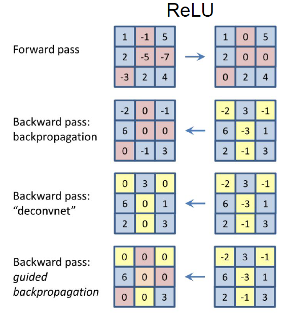 방법 자체는 Saliency maps때 했던 것과 유사하게, input에 대해서 gradient descent 작업을 수행해주면 된다. 추가적으로 backprop을 수행할 때 positive gradient만을 Relu에 통과시키면 조금 더 깔끔한 이미지를 얻을 수 있다.