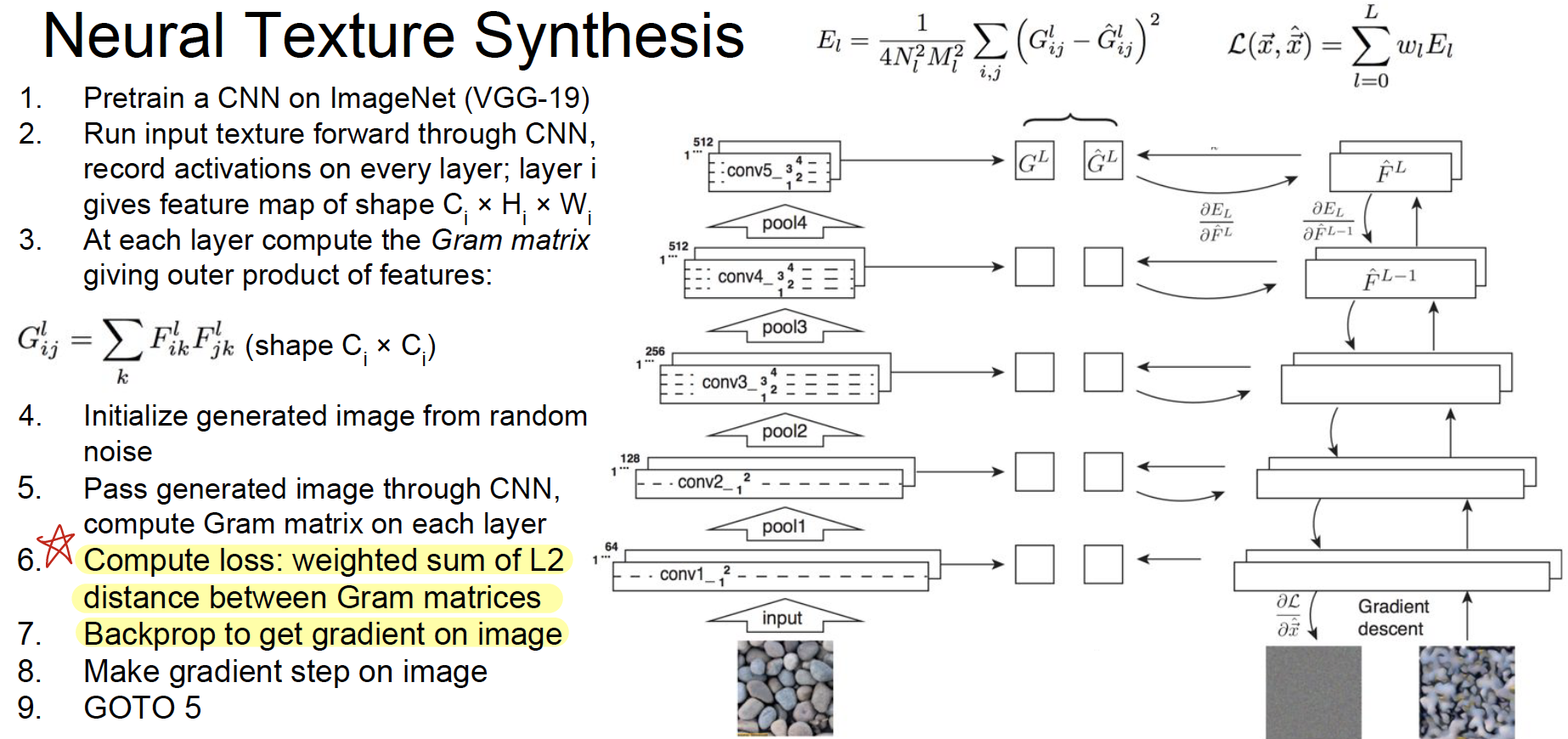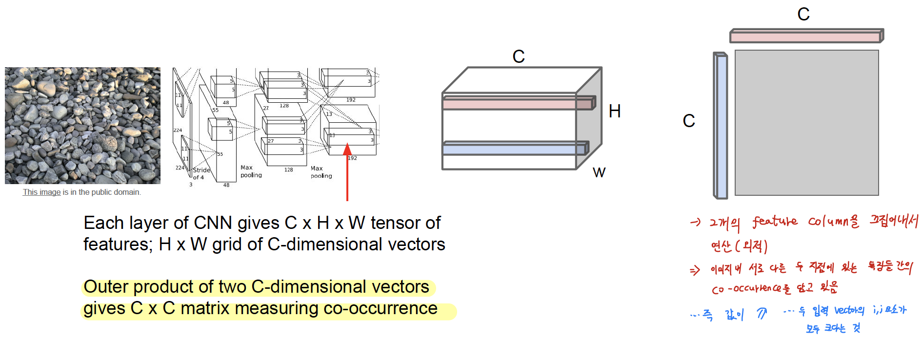 이 방법은 원하는 input image를 CNN에 집어 넣고, 특정 layer에 있는 2개의 feature column을 끄집어내서 외적연산을 취해 Gram Matrix를 얻는다. 이 과정을 수행함으로써 이미지 내 서로 다른 두 지점에 있는 특징들 간의 co-occurrence를 알 수 있게 된다. 해당 matrix에서 값이 크다는 것의 의미는 입력 vector의 i, j 요소가 모두 크다는 것을 의미하게 된다.