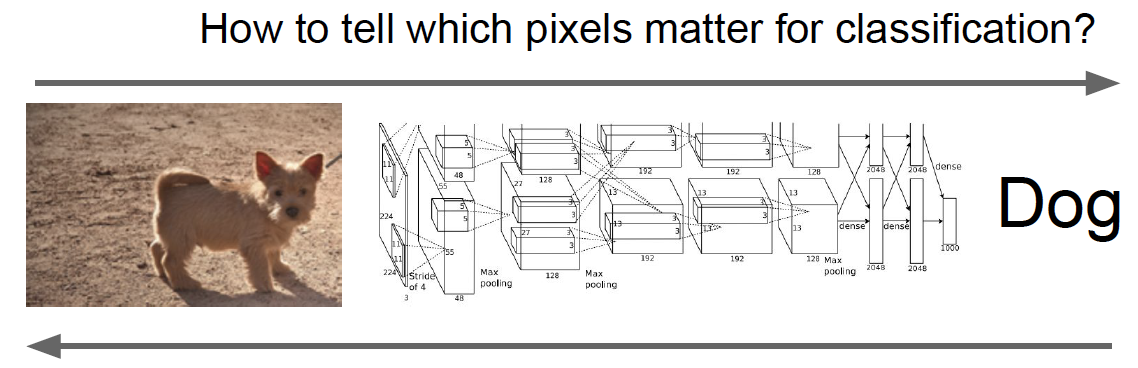 기존의 CNN의 경우는 input값을 고정시키고 weight를 backporp의 결과 변화시켰다면, 이 방법론은 학습시킨 CNN의 weight를 고정시키고 input의 변화에 따른 loss의 변화를 체크하는 것이다. 잘 생각해보면 input pixel이 움직임에 따라 classification score이 움직이는 양상을 추적하는 것이므로, 이는 중요한 pixel을 판단하는 과정과 유사하게 바라볼 수 있다.