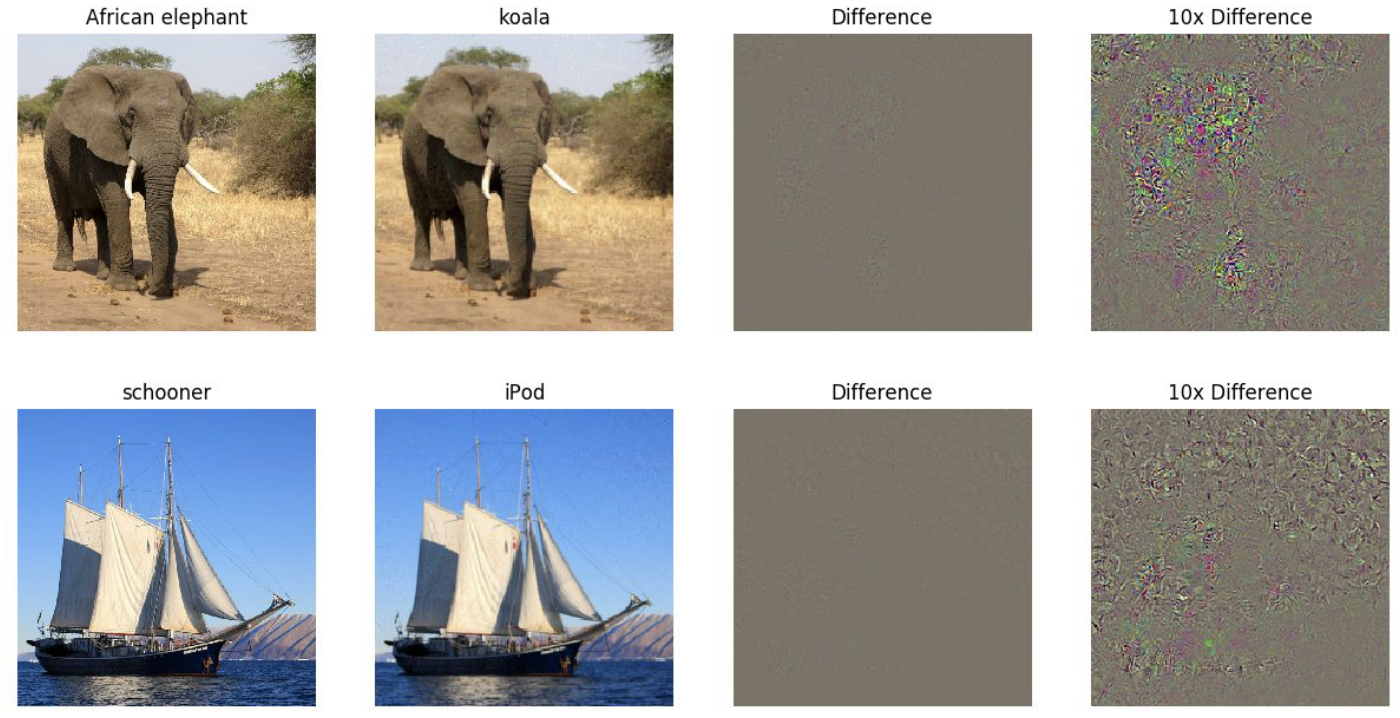 즉 위 사진에서 볼 수 있는 것처럼 인간의 눈에는 둘 다 elephant로 보이지만, 한쪽은 elephant 다른 한쪽은 koala로 학습하는 결과를 가져오게 된다.
