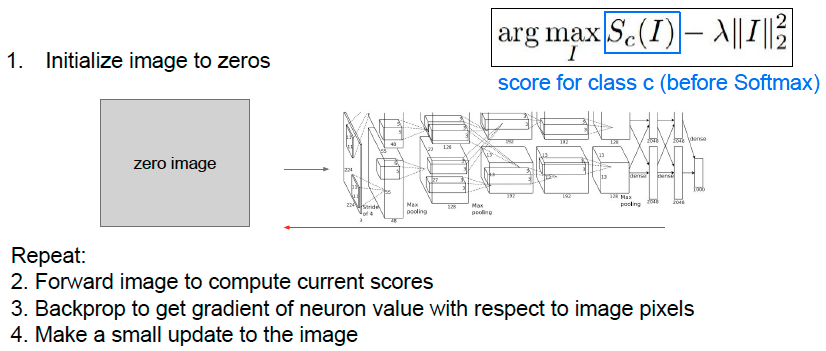 이 작업은 zero based input으로 시작하는 것이 아니라 특정한 image에서 시작하되, gradient ascent를 통해 특정 class에 대해 maximize되게끔 이미지를 수정하는 것이다.