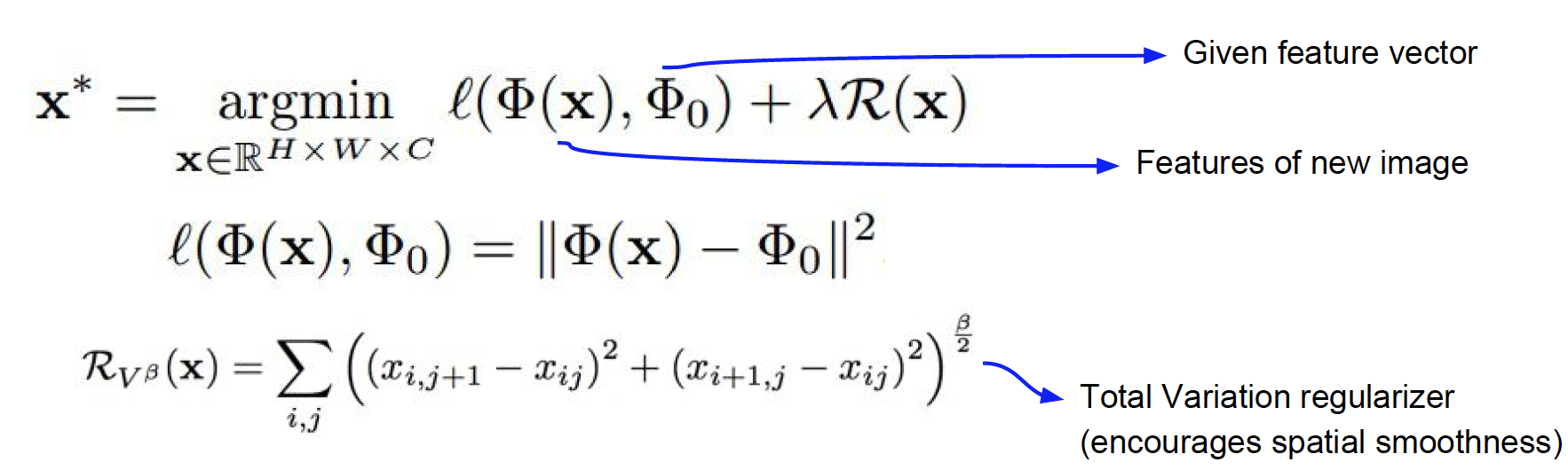 $$\ell (\Phi (x), \Phi _0 ) = \begin{Vmatrix} \Phi (x), \Phi _0 \end{Vmatrix}^2 $$ 식을 보면 알겠지만, score나 중간 neuron을 최대로 활성화시키는 것이 목표가 아니라 특징 벡터간 거리를 최소화시키는 것이 목표이다. (참고로 $\Phi _0$가 저장한 Activation map이다.)즉, Activation map과의 차이가 작게끔하는 이미지를 찾고 이를 통해 해당 layer가 어느 부분을 바라보고 있는지를 추측하는 것이다. Regression의 경우는 인접 픽셀 사이의 차이에 대한 패널티를 부여하는 것이다. 이를 통해 spatial smoothness를 휙득하게 된다.