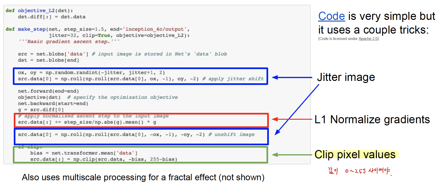 Jitter image(이미지를 살짝 움직임)의 경우는 일종의 Regularization의 역할을 수행하게 된다. 이를 통해 extra smoothness를 휙득하게 된다. 또한 L1 normalize를 시키고, 값이 0 ~ 255 사이여야하므로 pixel value를 clip처리해준다.