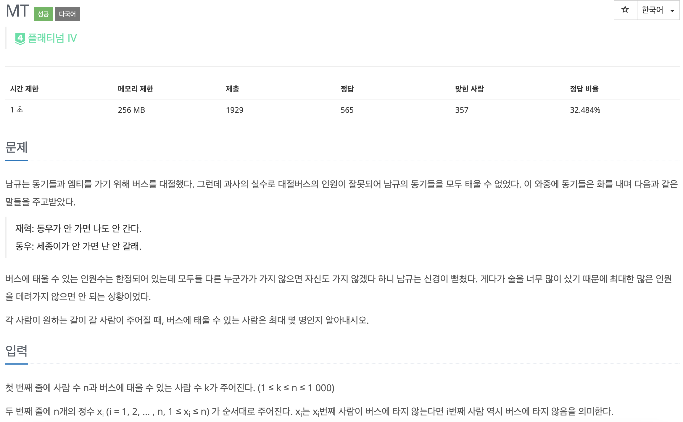 문제 https://www.acmicpc.net/problem/10265 10265번: MT 남규는 동기들과 엠티를 가기 위해 버스를 대절했다. 그런데 과사의 실수로 대절버스의 인원이 잘못되어 남규의 동기들을 모두 태울 수 없었다.
