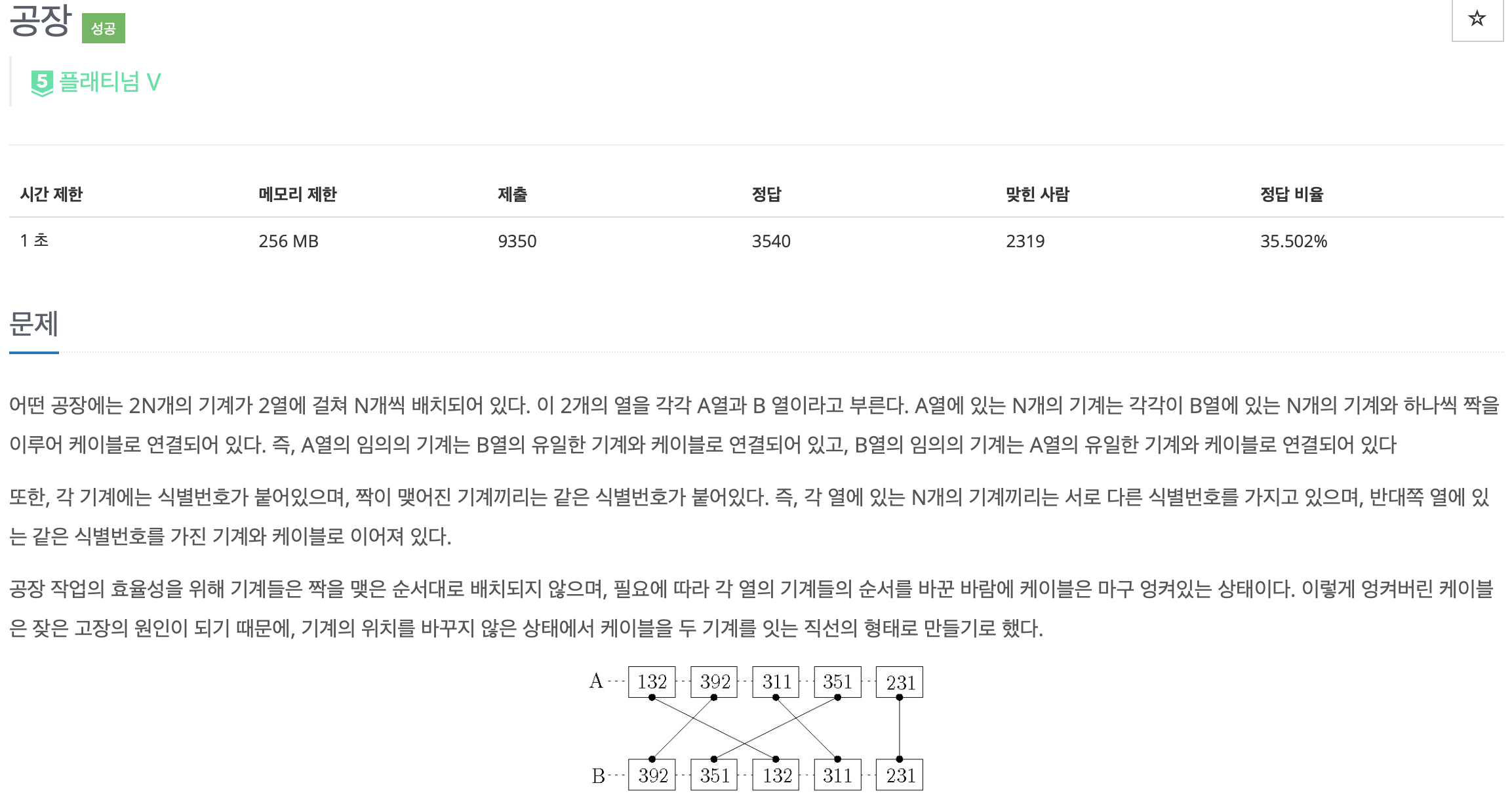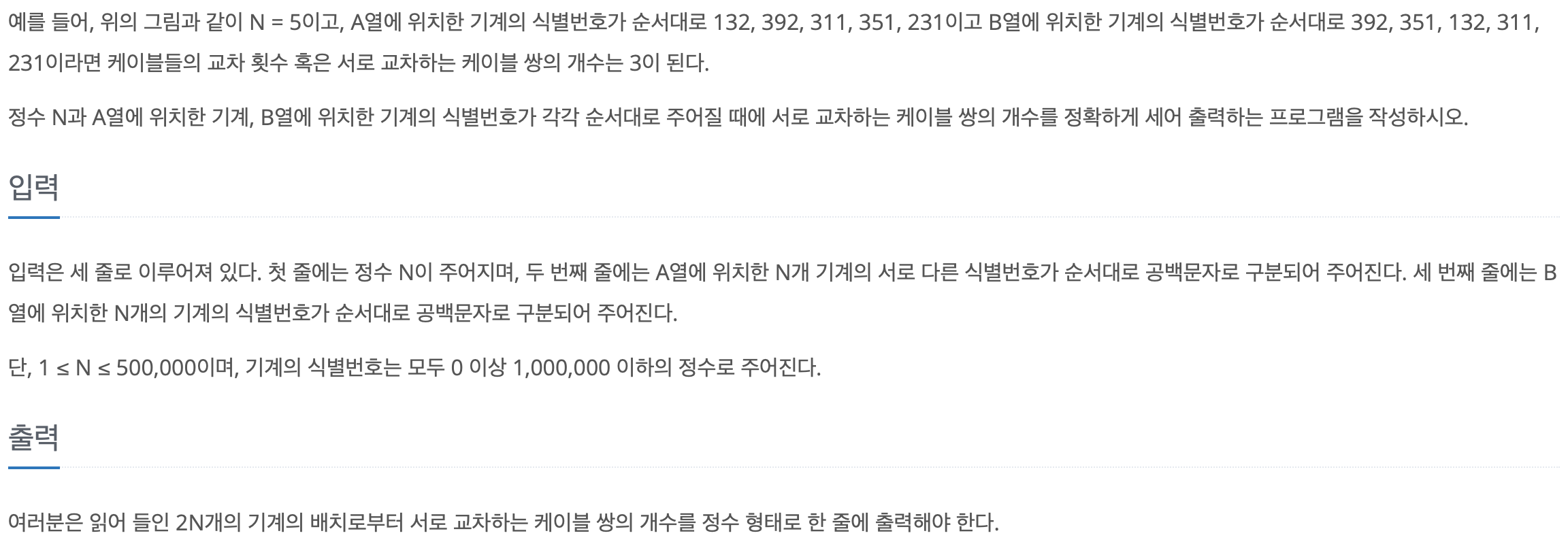 Problem Solving/BOJ [백준 7578번] [세그먼트 트리 / 스위핑] 공장 - 728x90 반응형 Approach Inversion counting임을 파악하고 병합정렬을 활용해서 풀어줄 수도 있다. 잘 생각해보면, B의 i번째 위치에 놓인 점에 의해 교차점이 발생하는 횟수는 자기보다 먼저 대응된 것 중에 자신보다 큰 것의 개수와 같다. 이렇게 되면, i번째 위치에 놓인 점의 이동 횟수를 구하는 시점에 자신보다 숫자가 큰 것의 개수만 구한 것과 B의 i ~ inf번째 위치에 놓인 것 중 대응된 것의 개수를 구하는 것이 동치가 된다. 예를 들어, a의 i번쨰 수가 B에 대응되는 index가 $b_{a_i}$라고 할 떄, 결과적으로 해당 선에 의해 교차점이 생기는 상황은 $b_{a_i}$부터 50000(inf) 위치 사이에 놓인 대응된 점의 개수와 동치이다. https://viyoung.tistory.com/393와 접근 방법이 거의 유사하다. [백준 2336번] [세그먼트 트리 / 스위핑] 굉장한 학생 Approach 상당히 재밌는 문제이다. 문제를 요약하자면, 3개의 시험에 대해서 모두 다 우월한 학생이 있는지를 판단하는 것이 굉장히 중요하다. 일단 첫번째 시험을 기준으로 오름차순으로 정렬을 viyoung.tistory.com 반응형 공유하기 게시글 관리 비룡의 컴퓨터이야기 Contents 당신이 좋아할만한 콘텐츠 [백준 2820번] [Lazy propagation / Euler Tour] 자동차 공장 2022.03.17 [백준 1395번] [Lazy propagation] 스위치 2022.03.16 [백준 17353번] [Lazy propagation] 하늘에서 떨어지는 1, 2, ..., R-L+1개의 별 2022.03.14 [백준 14288번] [오일러 투어 테크닉 / Lazy propagation] 회사 문화 4 2022.03.12 댓글 0 + 이전 댓글 더보기