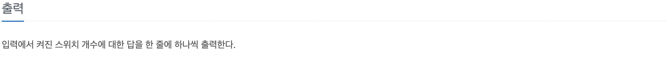 이 문제도 XOR의 성질을 활용하여 XOR을 2번 처리하면 처리하지 않은 것과 같다는 것을 이용한 문제였는데, 스위치 또한 2번 조작하면 결과적으로 하나도 조작하지 않은 것과 같다는 점에서 완벽하게 동일한 문제라고 할 수 있겠다.