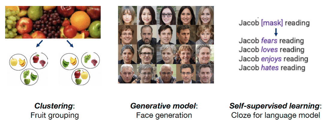 A dataset has no labels. This type of learning highly popular in modern days because labeling is so expensive. Actually, combining supervised learning and unsupervised learning is the mainstream of the industry.