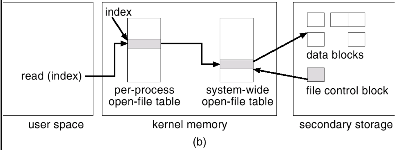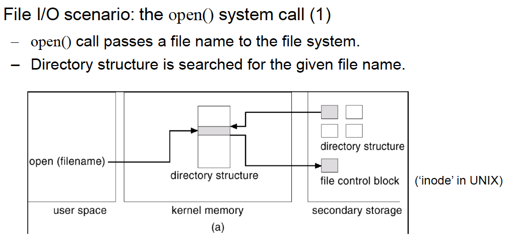 예를 들어 open() system call을 호출하면 해당 file에 대한 정보가 open-file table에 있는지 확인하고, 없다면 directory search를 해서 open-file table에 해당 정보를 저장한다. (해당 directory의 entry를 open file table의 entry로 복사한다.) 이후 open() system call은 file descripter 라는 pointer를 제공한다. 해당 pointer는 open-file table의 entry를 지시하는 포인터이다. (해당 pointer는 모든 I/O operation에 사용되게 된다.)
