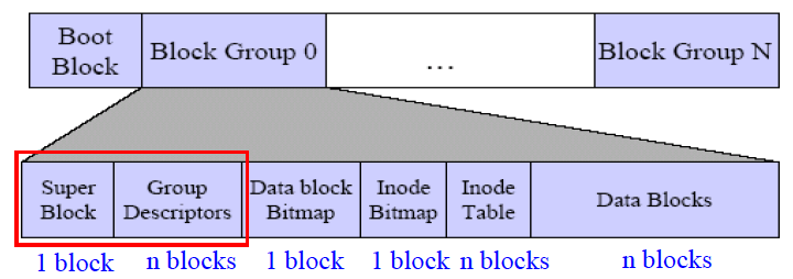 Boot Block(boot sector)을 제외하고 동일한 사이즈의 Block Group으로 나눔. 각 group의 첫번째를 superblock으로 할당한다.