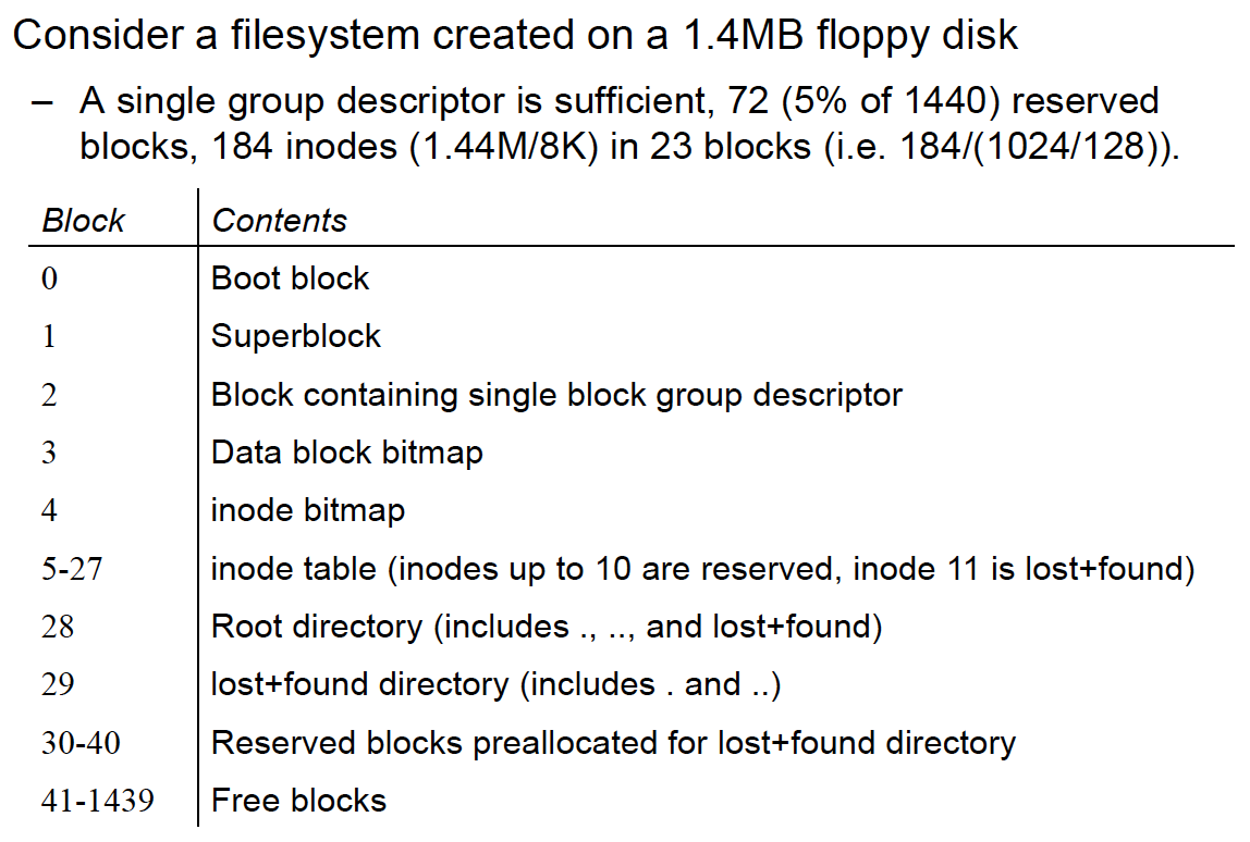 여기서 8개의 block마다 1개의 inode를 할당한다고 했고, 1개의 block size가 1KB이므로, 1.44MB/8K를 해서 184가 나오는 것이다. 추가적으로 1개의 inode는 128KB이므로, 1개의 block 당 inode를 8개 담을 수 있다. 따라서 inode를 담을 수 있는 block 23개가 필요하게 된다.