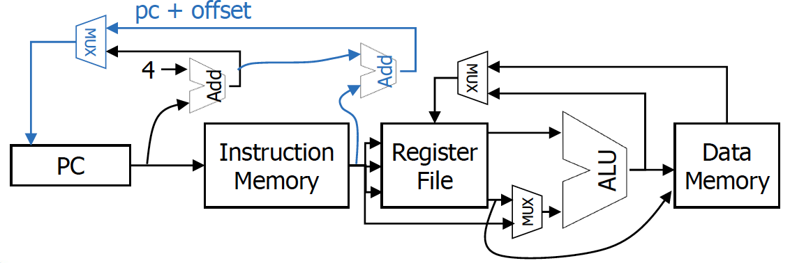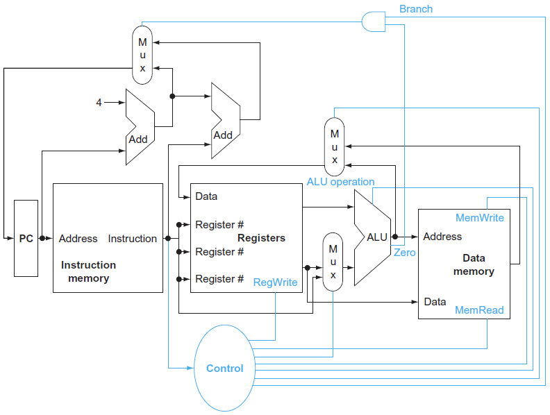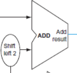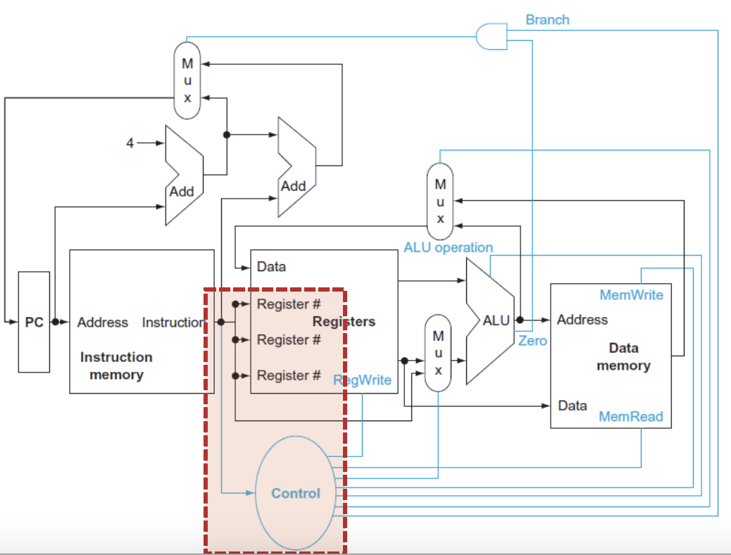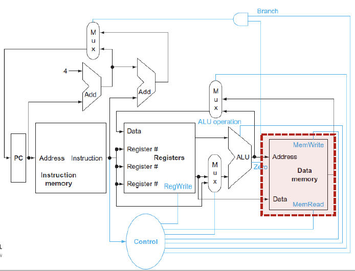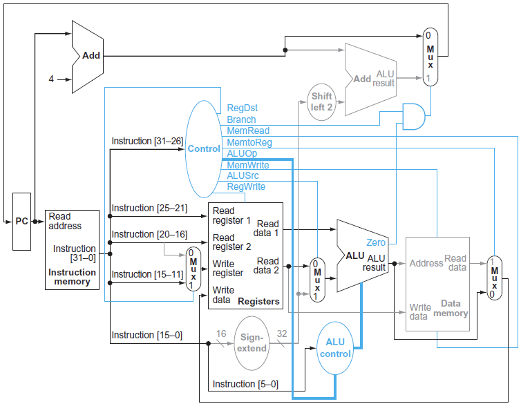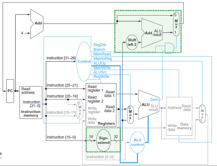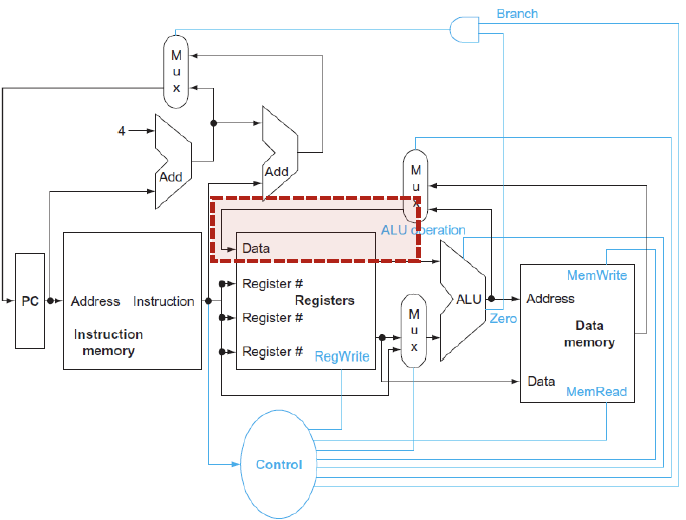 - beq : rs와 rt가 ALU의 input으로 들어가고, ALU의 zero output을 사용해서 branch여부를 판단하게 된다.