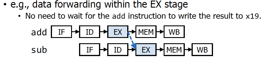 사실 생각해보면 WB할 때까지 기다릴 필요가 없다. t2에 저장될 값은 EXE 단계가 끝나면 이미 가지고 있다. 따라서 해당 값을 처리하자마자 sub의 input으로 주면 stall 시간을 단축시킬 수 있다. 이처럼 추가적인 하드웨어를 집어넣어서 미리 정보를 받는 받는 것을