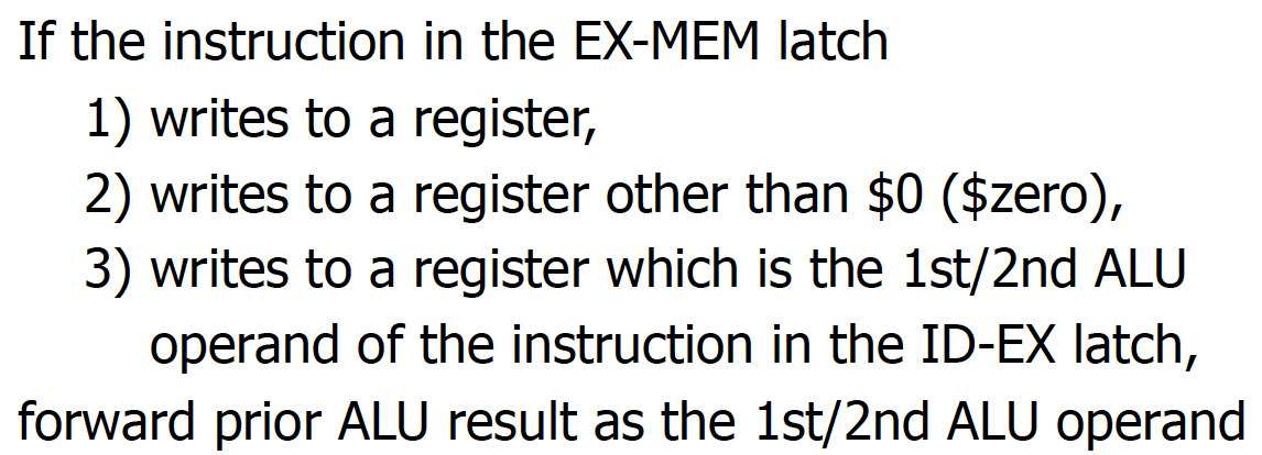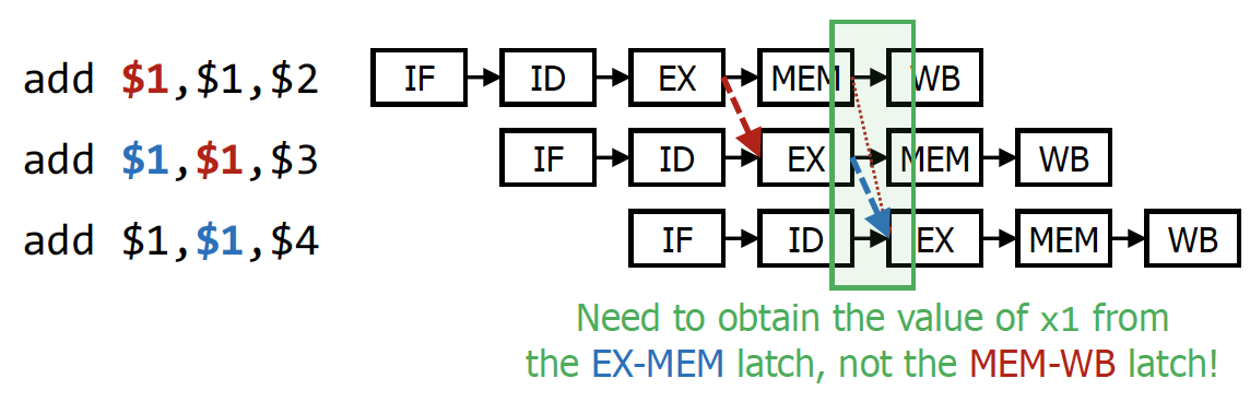 EXE/MEM latch와 MEM/WB latch에서 forwarding할 필요성도 존재하게 됨