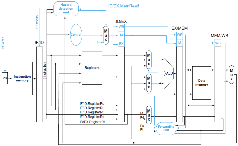 - load-use data hazard의 경우는 메모리로부터 값을 가져와야 하기 때문에 해당 정보는 MEM/WB에 존재한다.