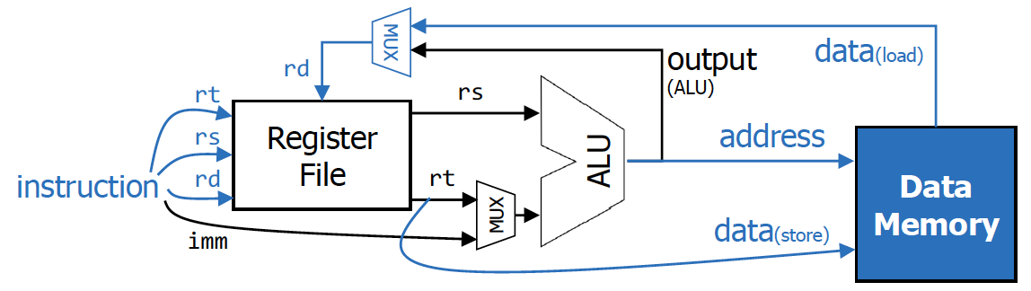 - 나머지 (addi) : rs와 imm가 ALU의 input으로 들어가고, ALU의 output을 rd에 저장하게 됨