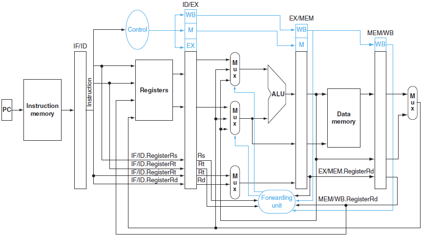 - EXE의 결과를 가져오는데, 2단계 이후까지 가져올 수 있어야 한다는 점에서 EXE/MEM latch와 MEM/WB latch에서 forwarding해야한다.