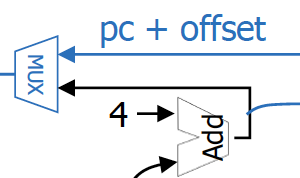 위에 있는 mux는 pc + 4와 pc + 4 + immediate << 2 중 어느 것을 사용해야하는지를 결정해야 한다. 따라서 branch를 0으로 설정한다.