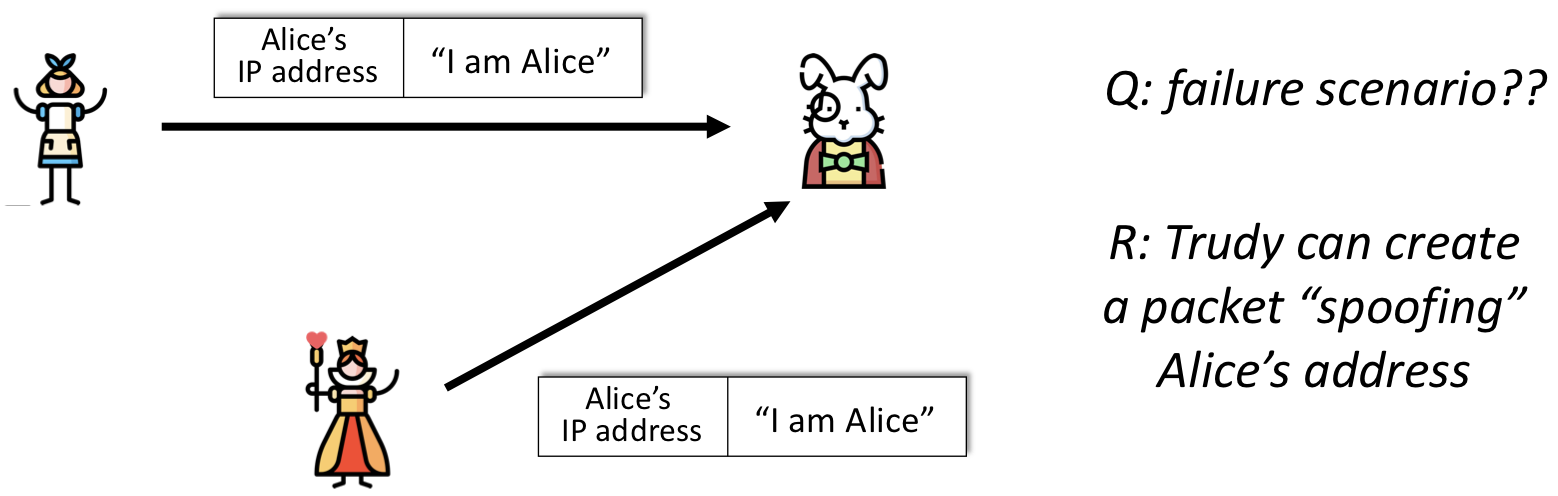 Alice says “I am Alice” in an IP packet containing her source IP address