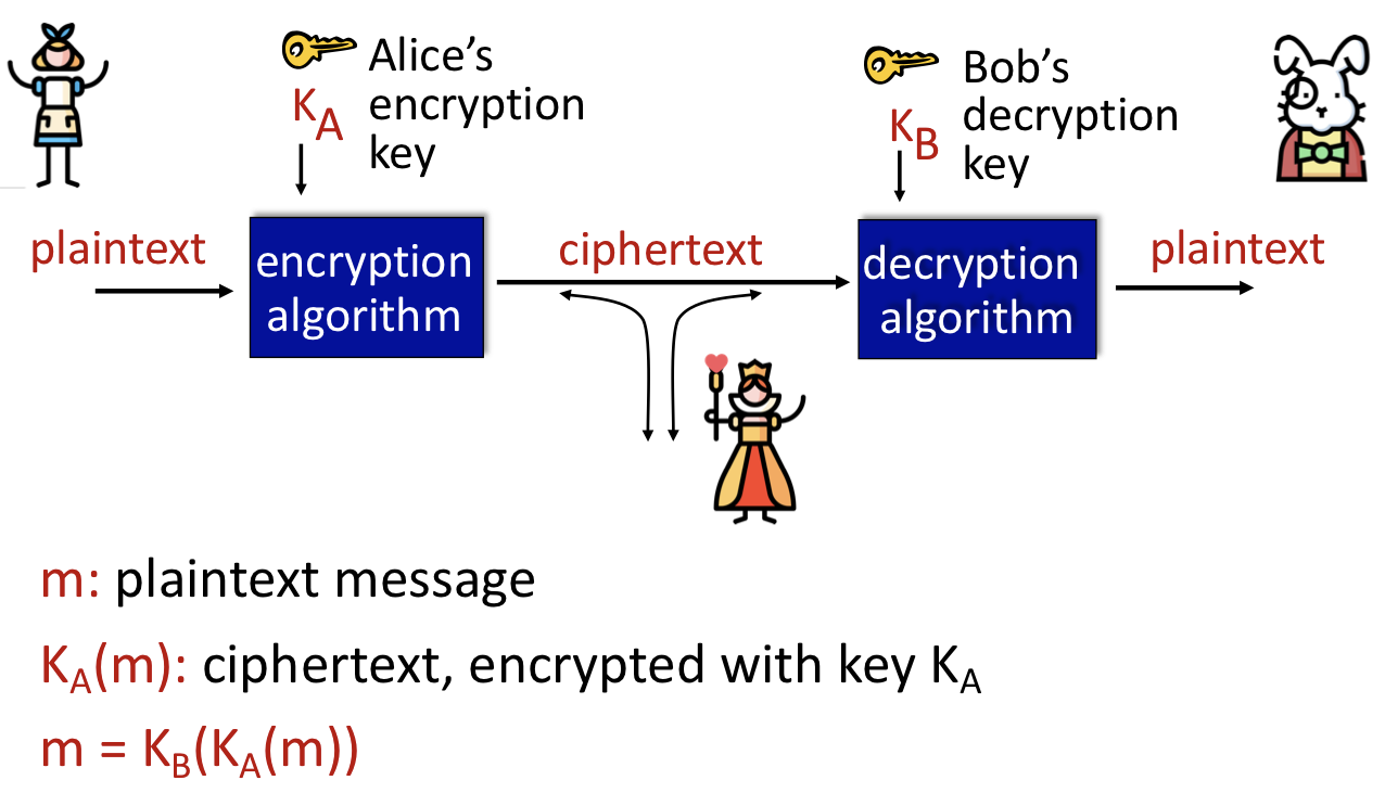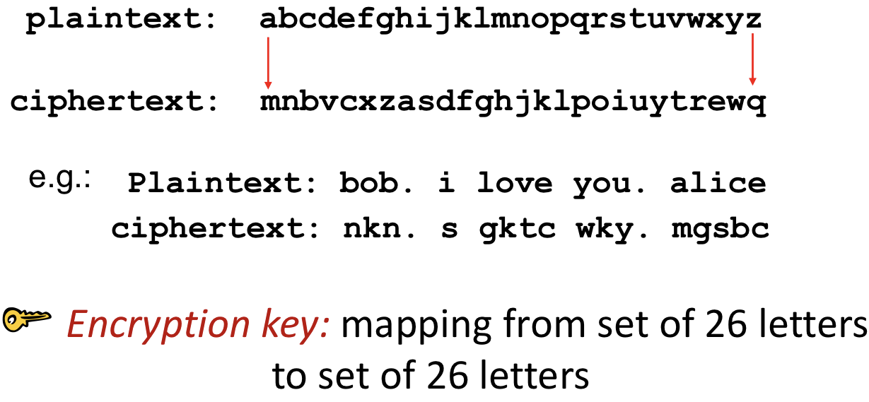 - Confidentiality via encryption : 암호화를 통해서 정보의 기밀성을 보장하는 것. 즉, 허가되지 않은 사람들이 해당 내용을 읽거나 해독할 수 없게끔하는 것