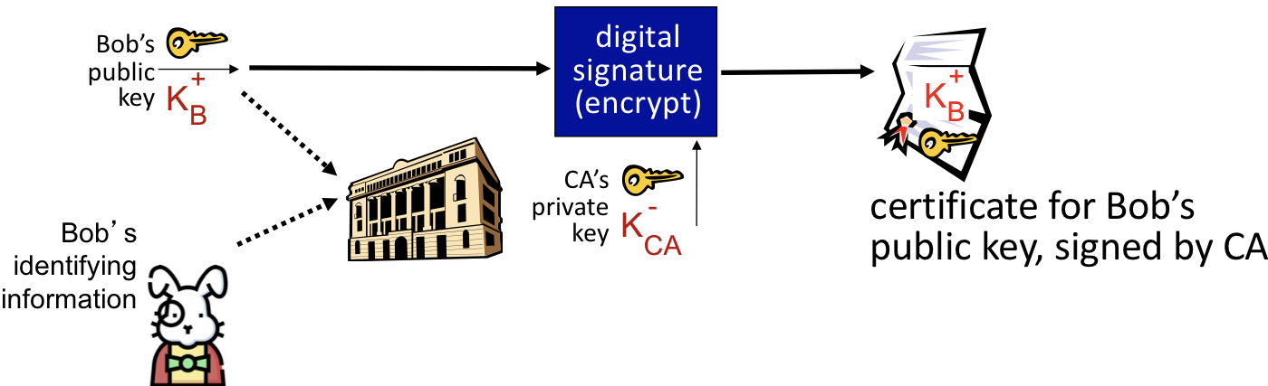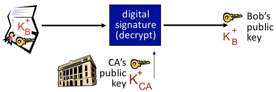- Apply CA’s public key to Bob’s certificate, get Bob’s public key