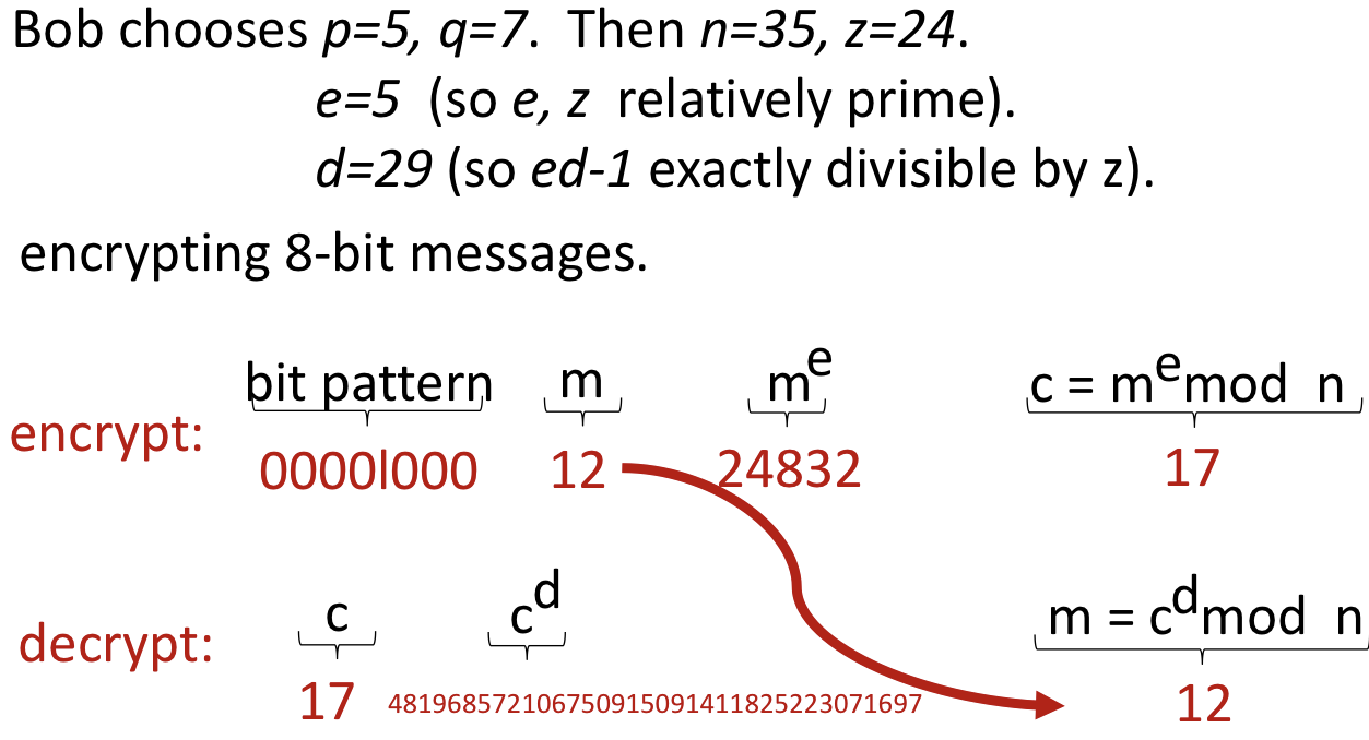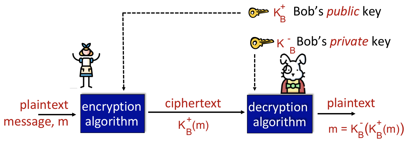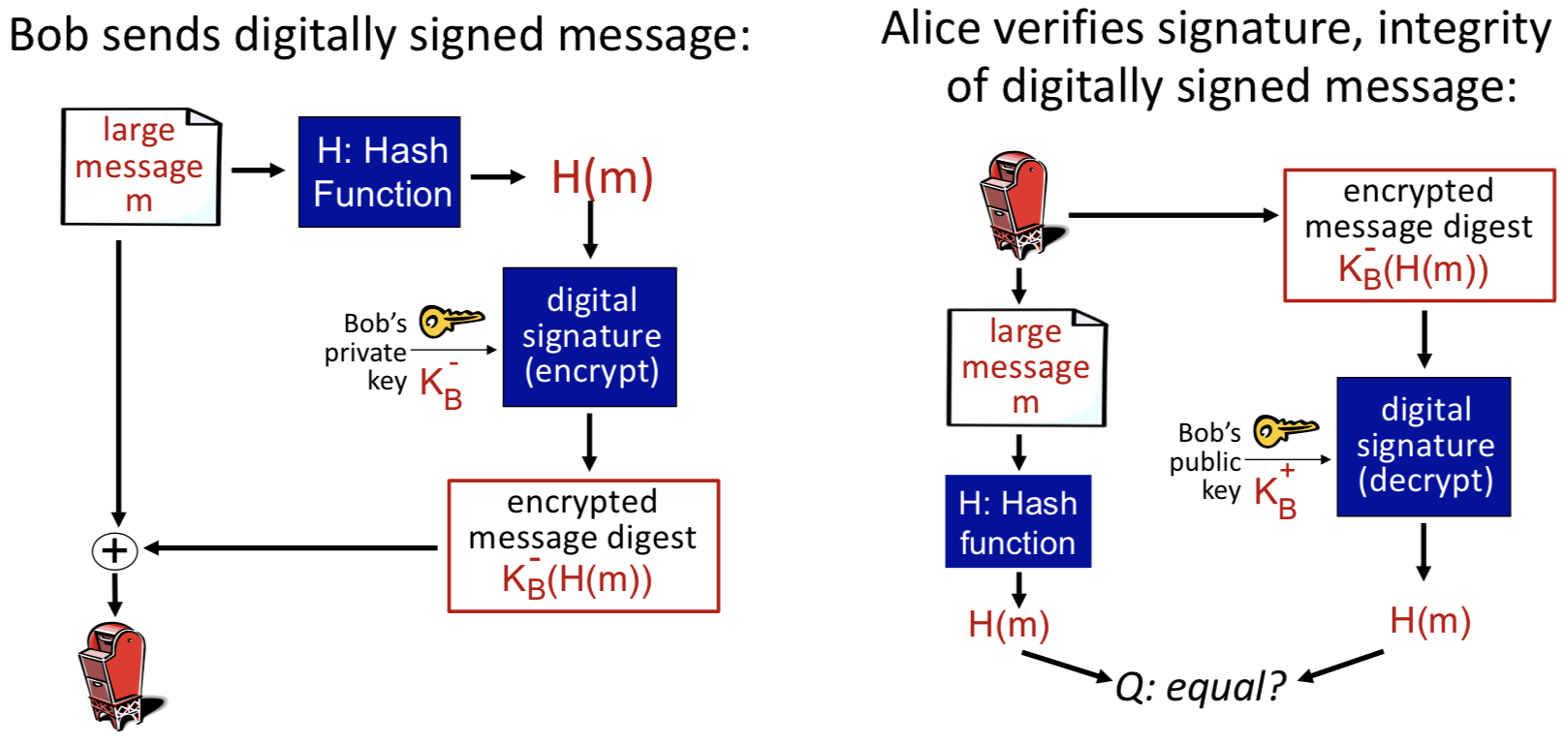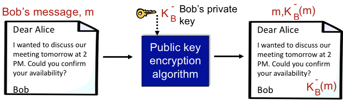 - Alice verifies m signed by Bob by applying Bob’s public key KB+ to KB−(m) then checks KB+(KB−(m))=m