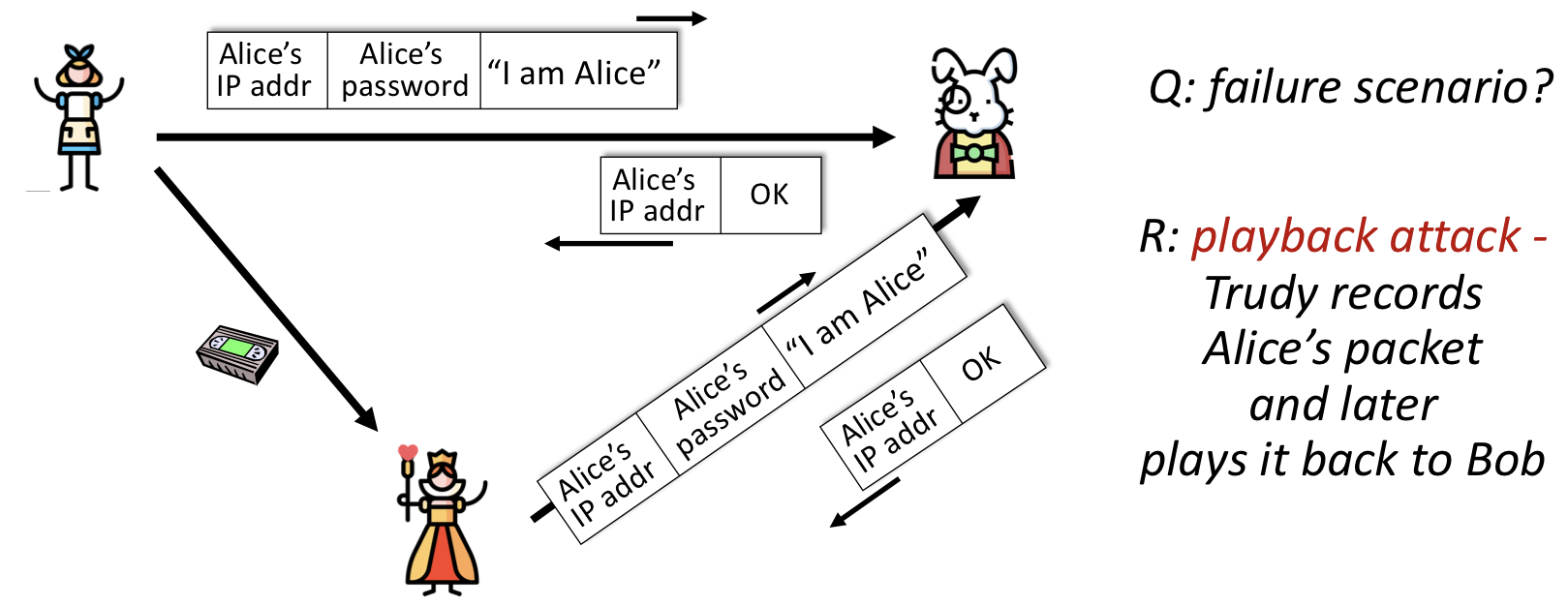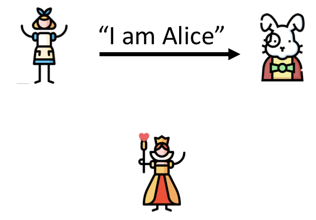 Alice says “I am Alice” and sends her secret password to “prove” it