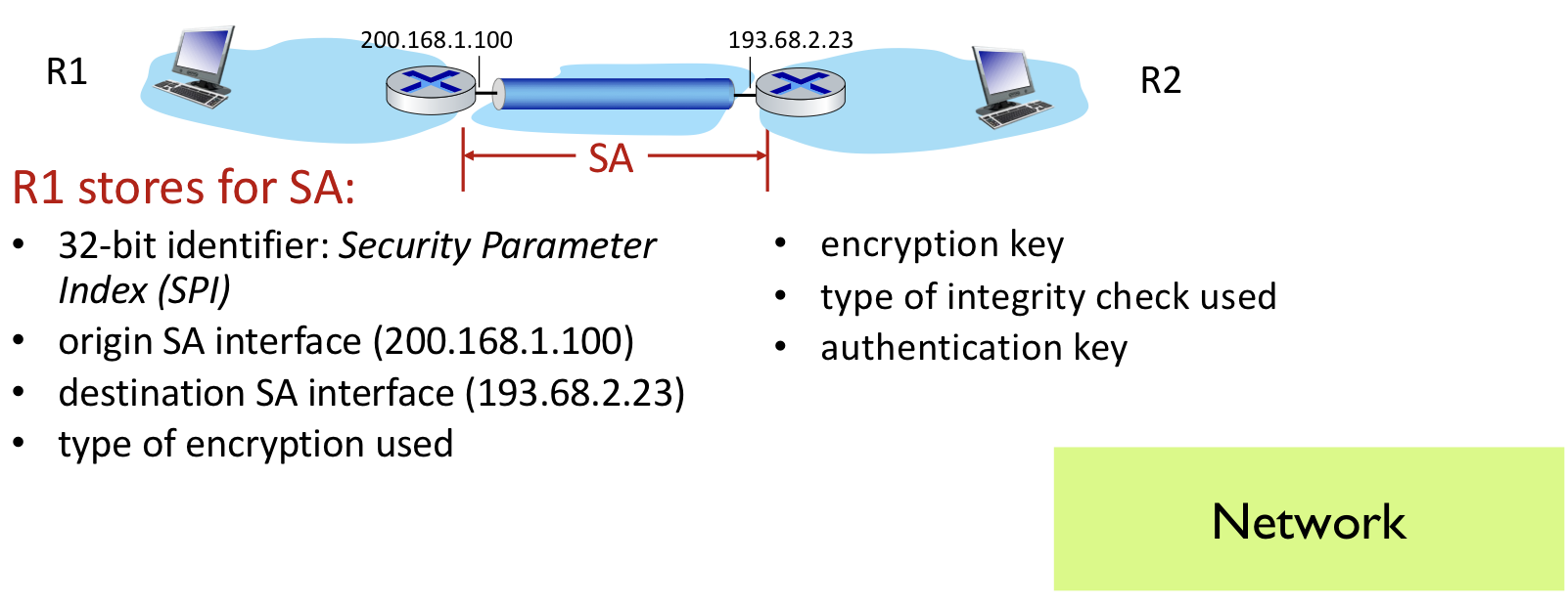 IPsec protocol은 network layer에서 security를 제공하기 위해서 데이터를 전송하기 위해 Security Association을 설정하는 것을 포함한다. 이때 security association는 single directional하므로 양방향 통신을 위해서는 2개의 security association이 필요하다.