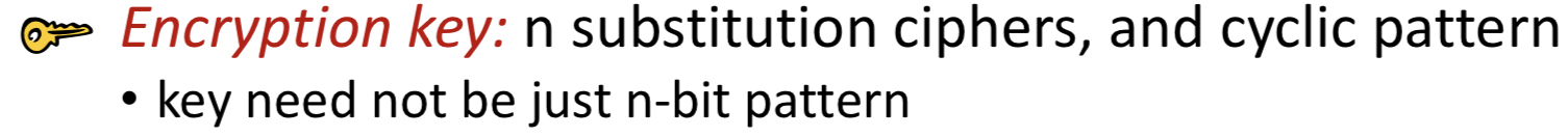 - for each new plaintext symbol, use subsequent substitution pattern in cyclic pattern
