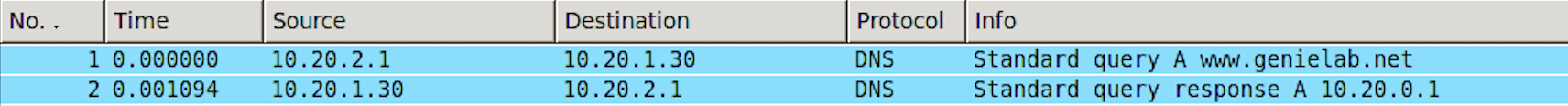 위의 상황은 www.genielab.net이라는 hostname의 IP주소를 알고 싶은 상황이고, 해당하는 IP 주소가 10.20.0.1라는 정보를 받은 상황이다.