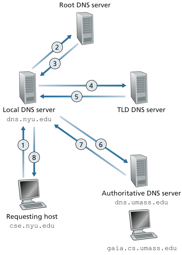 - 마지막으로 해당 도메인을 관리하는 authoritative DNS server에 'www.example.com' 의 실제 IP주소 정보를 얻어 사용자 컴퓨터에 반환한다