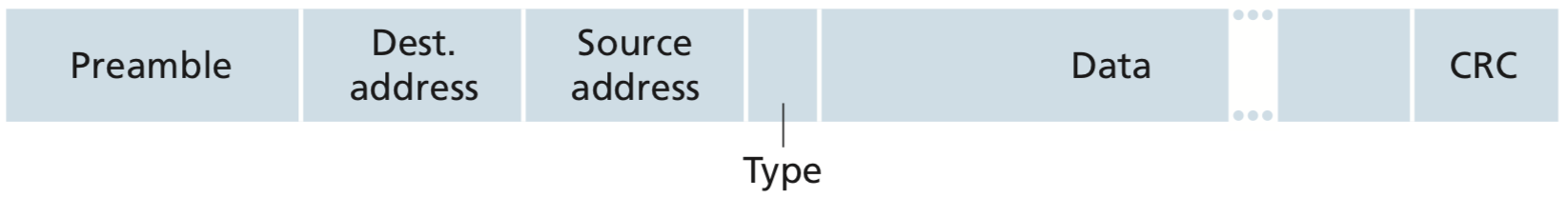- CRC (Cyclic redundancy check) field (4bytes) : frame에 bit error가 있는지 체크하는 목적