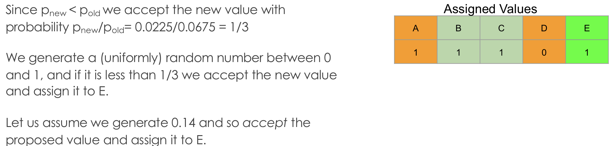 - Assign the value with probability p:min(1,pnew/pold). Otherwise it remains assigned the old value
