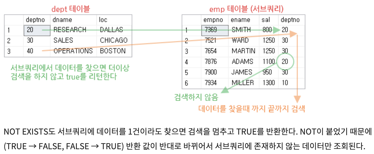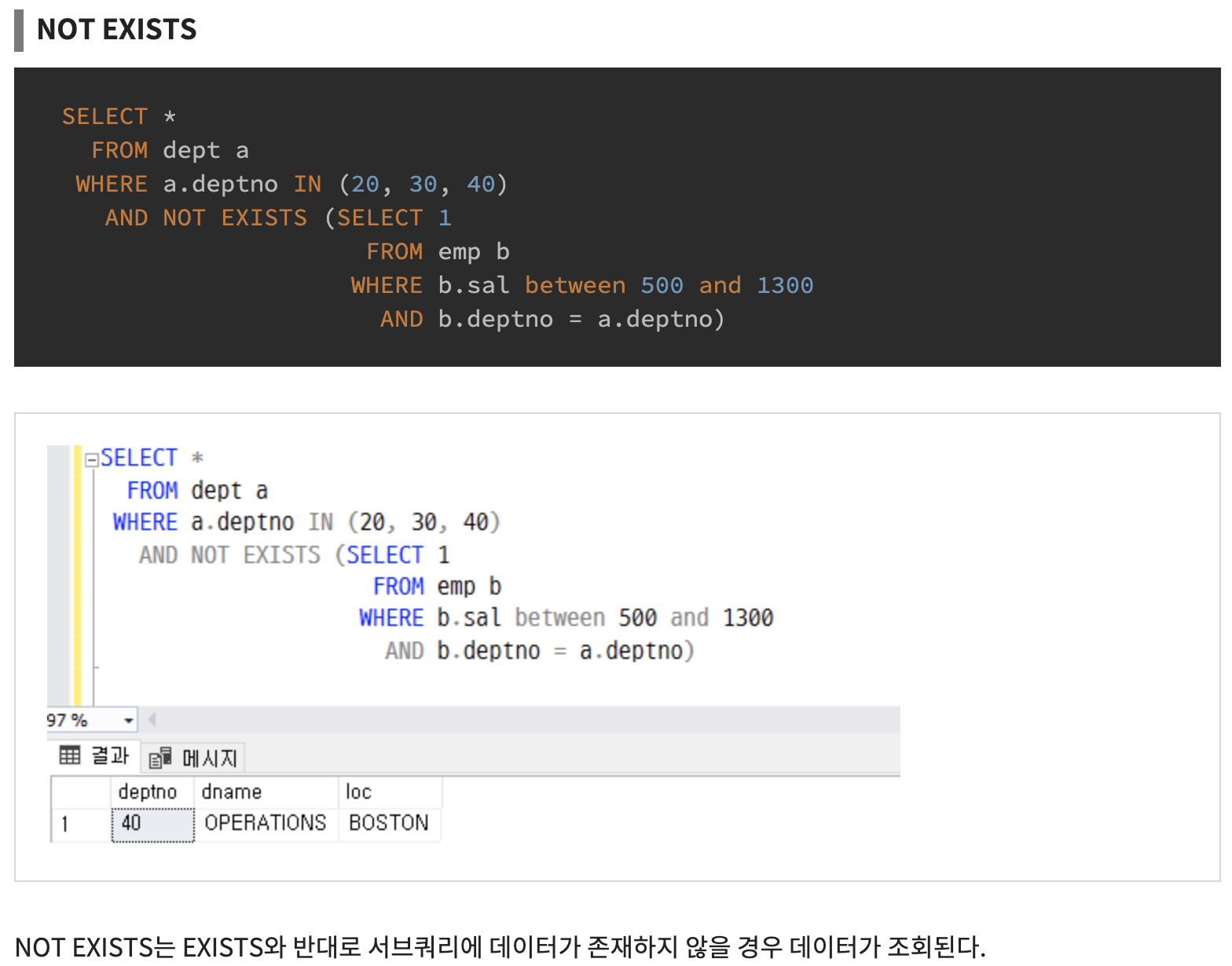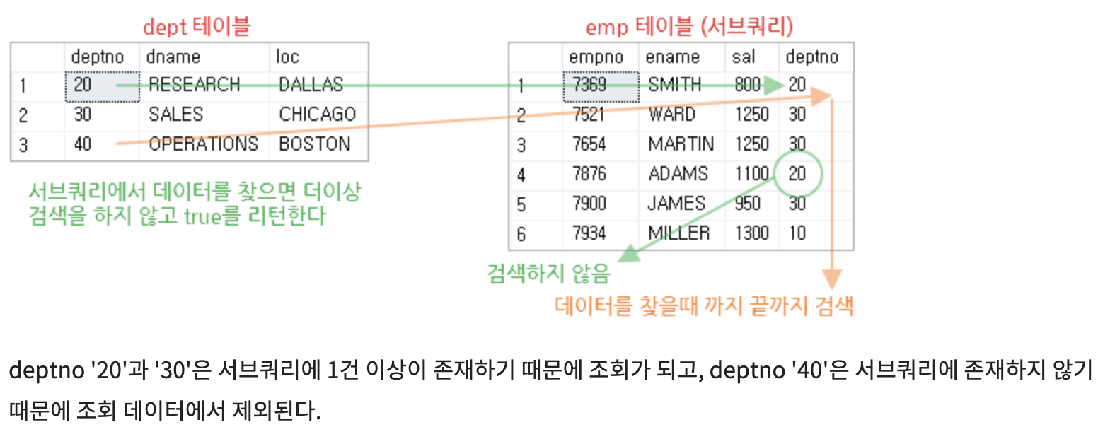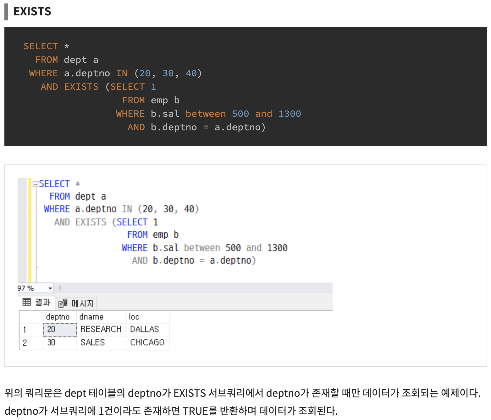 IN 연산자와 거의 비슷하지만, IN 연산자는 비교할 값을 직접 대입할 수 있지만 EXISTS 연산자는 subquery만 사용할 수 있다.