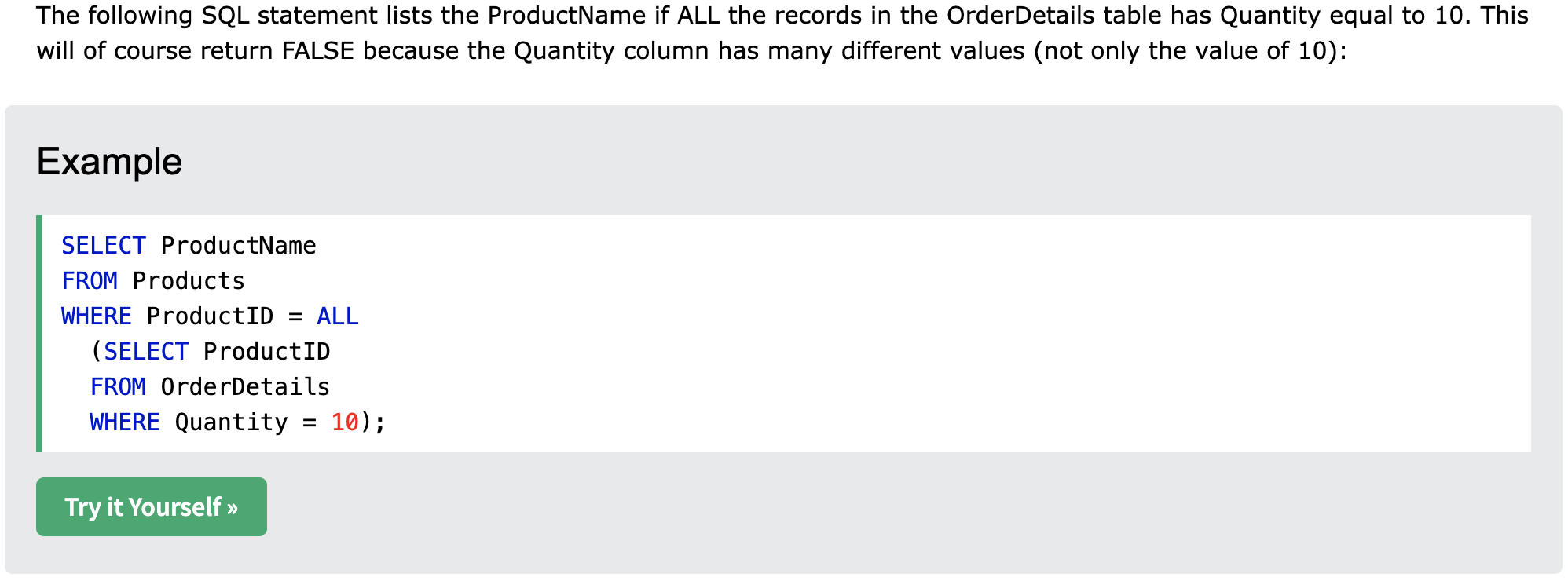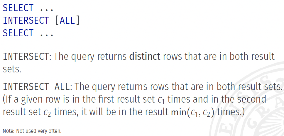 EXCEPT은 차집합이라고 생각해주면 된다. EXCEPT ALL의 경우에는 개수까지 고려하는 것이다.
