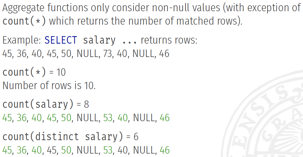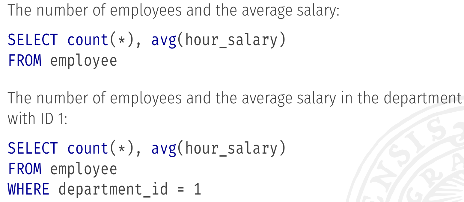Aggregate functions, e.g. count(), sum(), avg(), min(), max(), can be used to calculate summary statistics based on rows selected by a WHERE clause