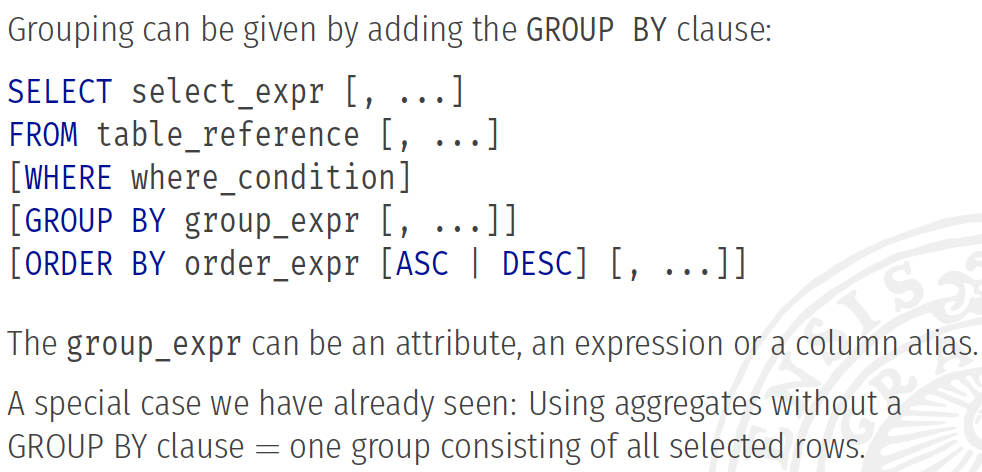 We can divide selected rows into groups based on the value of one or several attributes and calculate summary statistics in each group.